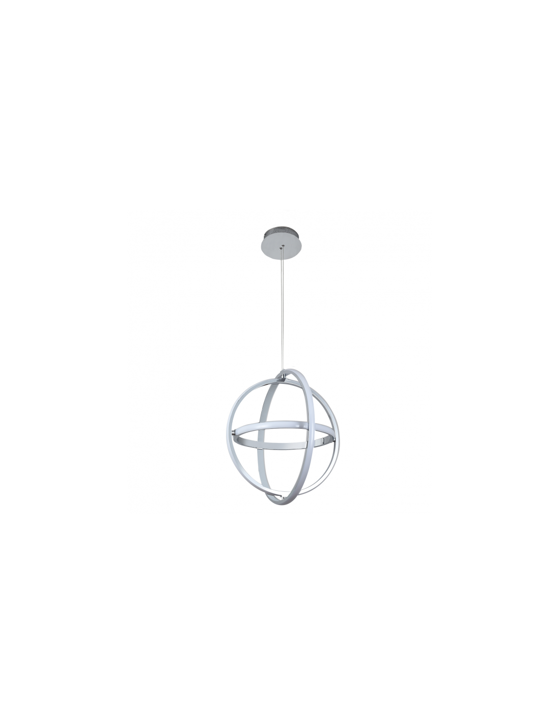 Colgante serie Cometa en color cromo. Este colgante se compone de tres círculos que conforman una esfera. Su tecnología es de led integrado con 39 w de potencia, 3900 lúmenes y 4000 ºk de color de luz en tono blanco neutro. Sus dimensiones son, 105x45x45 cm (con altura regulable). Está realizado en metal y policarbonato.