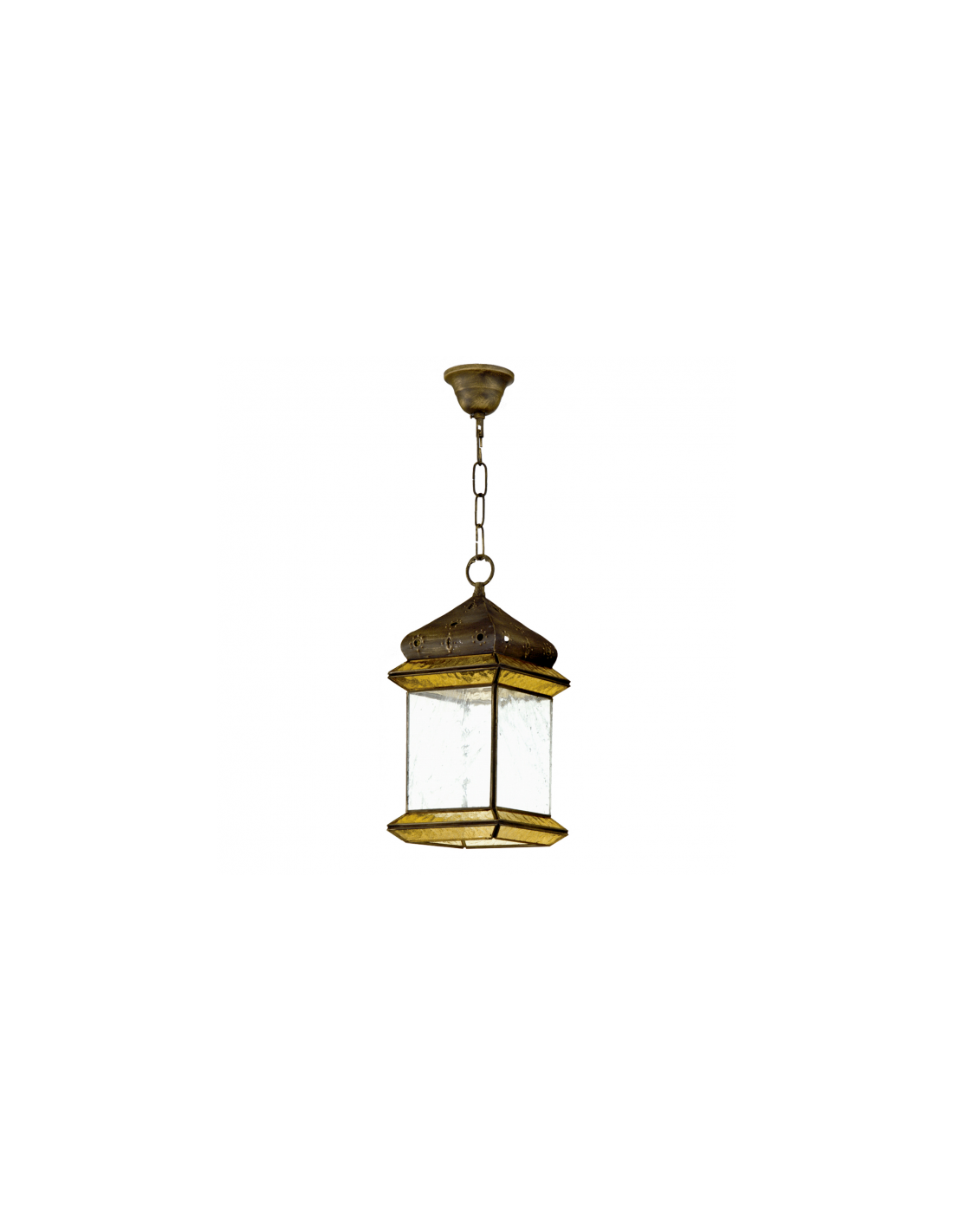 Colgante serie Ambarina color ámbar. Realizado en cristal y metal. Su diseño está inspirado en el arte califal. Sus dimensiones son, 70X18X18 cm (con altura regulable)y el portalámparas E27. Esta destinado para interiores o exteriores cubiertos. Destaca sus orificios en forma de estrella que aportan un juego lumínico.