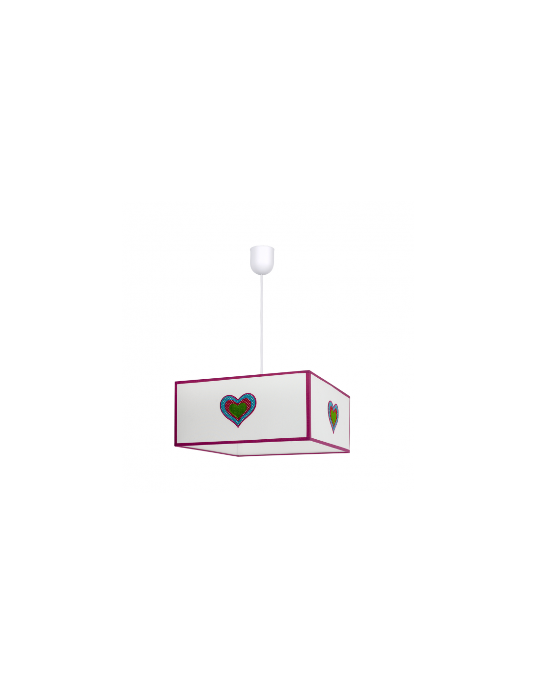 Colgante infantil serie Amor de color blanco/rosa. Realizado en material textil, destaca por su forma cuadrada y el motivo bordado en forma de corazón. Sus dimensiones son 35x35 cm, la altura de la pantalla son 16 cm y su altura total regulable. Portalámparas E27. Puede completar la serie con el sobremesa del mismo color.