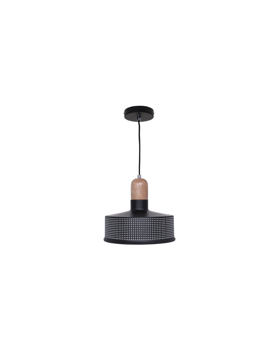 Colgante serie Anusca de color negro mate. Realizado en metal y madera, con pantalla perforada, la cual crea un juego lumínico muy interesante. Utiliza un portalámparas E27 . Su altura es regulable y está disponible también en color cobre, junto con con el pie de salón y sobremesa.