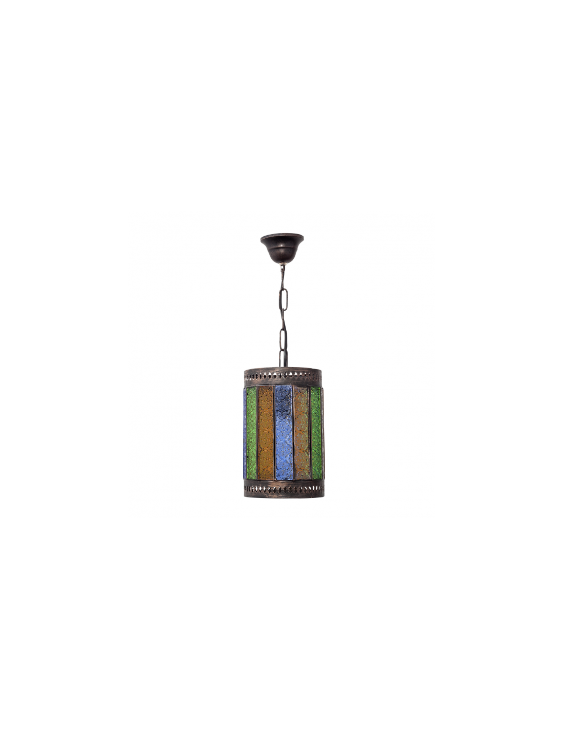 Colgante serie Casablanca de color marrón. Realizado en metal y cristal de colores con relieves. Su diseño está inspirado en el arte marroquí. Los cristales de color le otorgan variedad lumínica. Sus dimensiones son, 55X18x18 cm con altura regulable. El portalámparas es E27. Está disponible también el aplique.