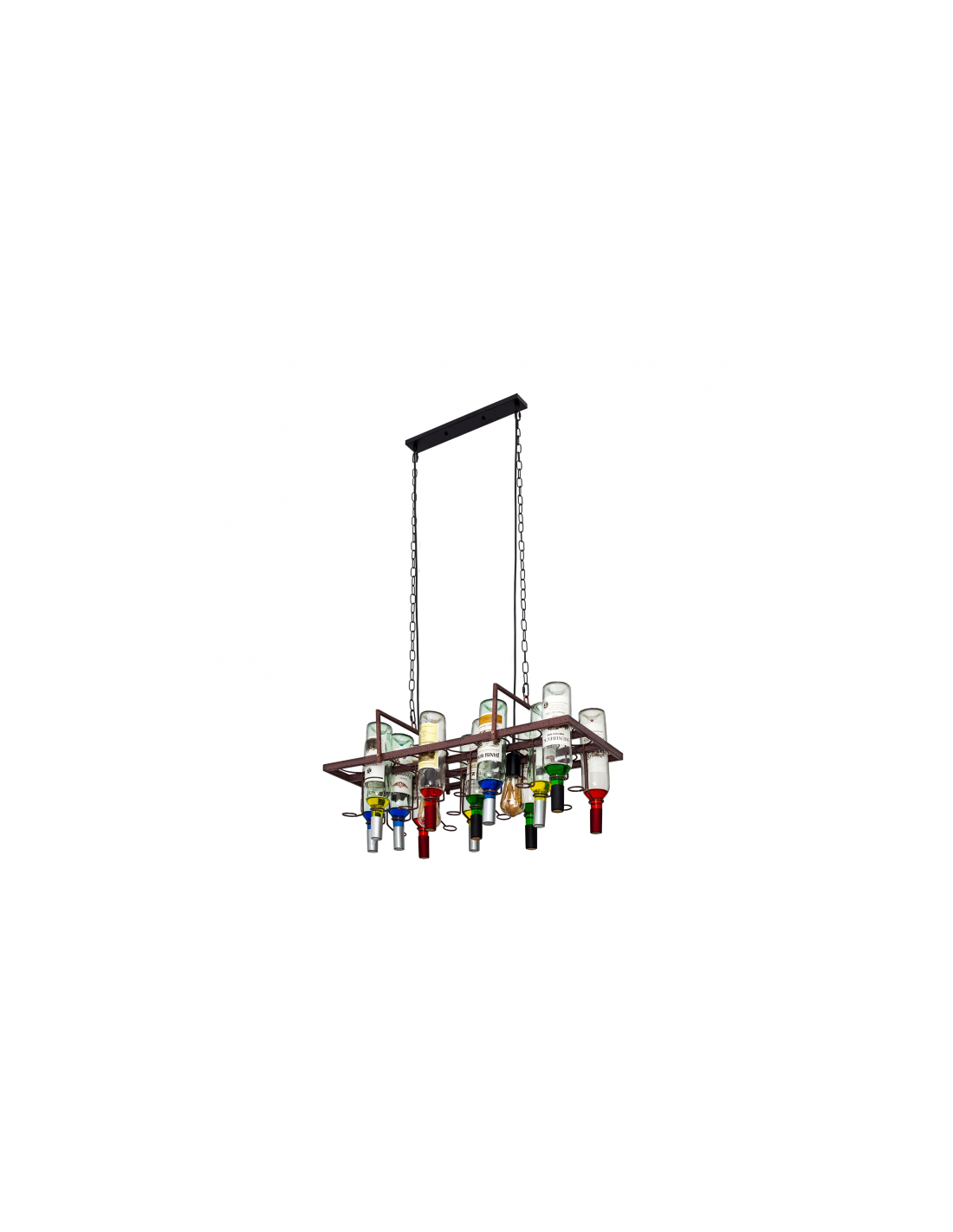 Colgante serie Bodega de color marrón rústico. Este original colgante está realizado en metal muy resistente. Está decorado con doce botellas de vidrio de diferentes colores. Este color viene dado por un fluido que puede llenarse al nivel deseado creando así un juego lumínico muy interesante. Las botellas pueden ser sustituidas también por otras. Sus dimensiones son, 120X78X32 cm (altura regulable) el portalámparas es E27. Está disponible también el modelo pequeño con capacidad de hasta 8 botellas.