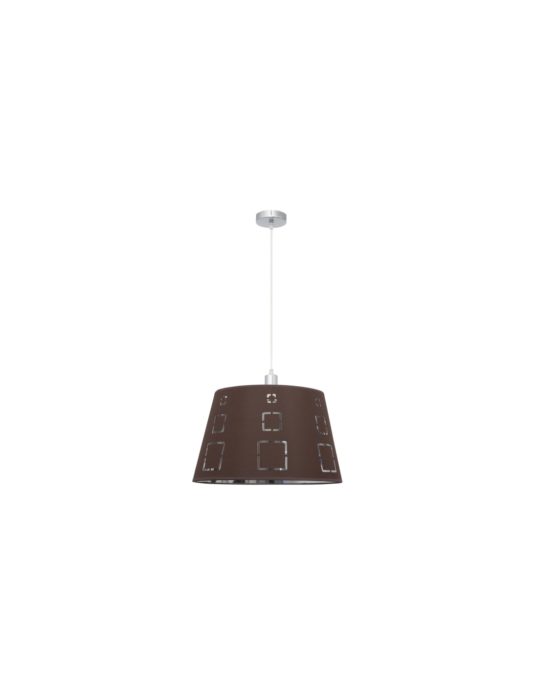 Colgante serie Celaya de color marrón. Realizado en metal color cromo y material textil. La pantalla presenta un diseño con formas geométricas caladas que dejan pasar la luz. Sus dimensiones son, 110x40x40 cm con altura regulable. Está disponible el sobremesa y pie de salón en marró y varios colores. El portalámparas es E27.