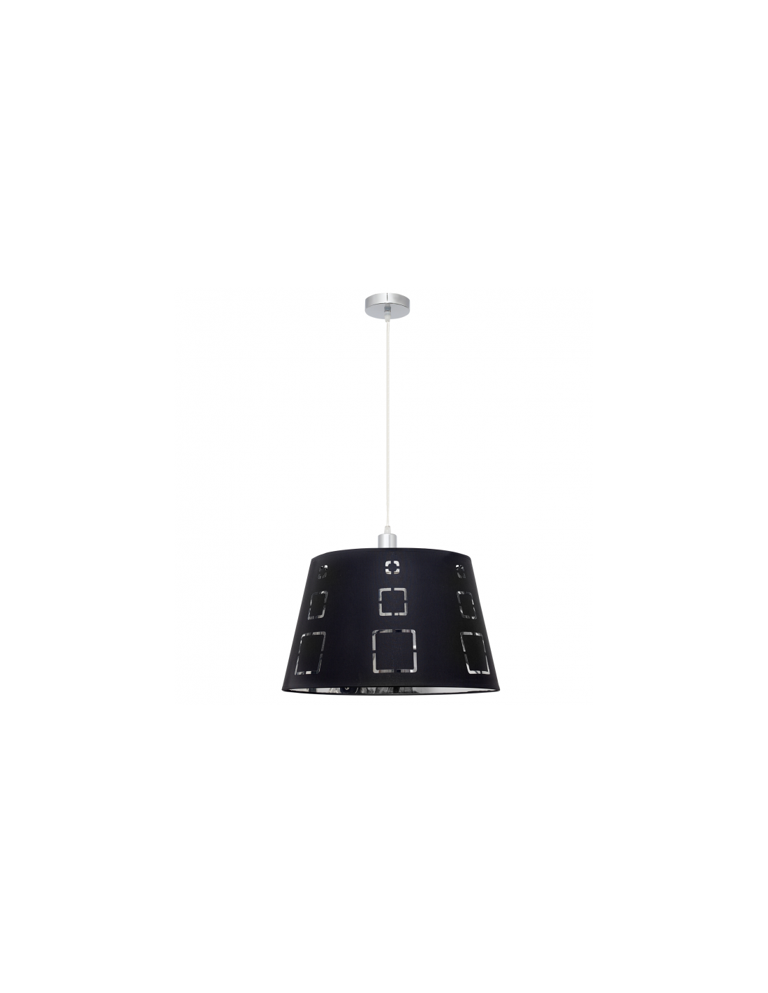 Colgante serie Celaya de color negro. Realizado en metal color cromo y material textil. La pantalla presenta un diseño con formas geométricas caladas que dejan pasar la luz. Sus dimensiones son, 110x40x40 cm con altura regulable. Está disponible en otros colores además del sobremesa y pie de salón. El portalámparas es E27.