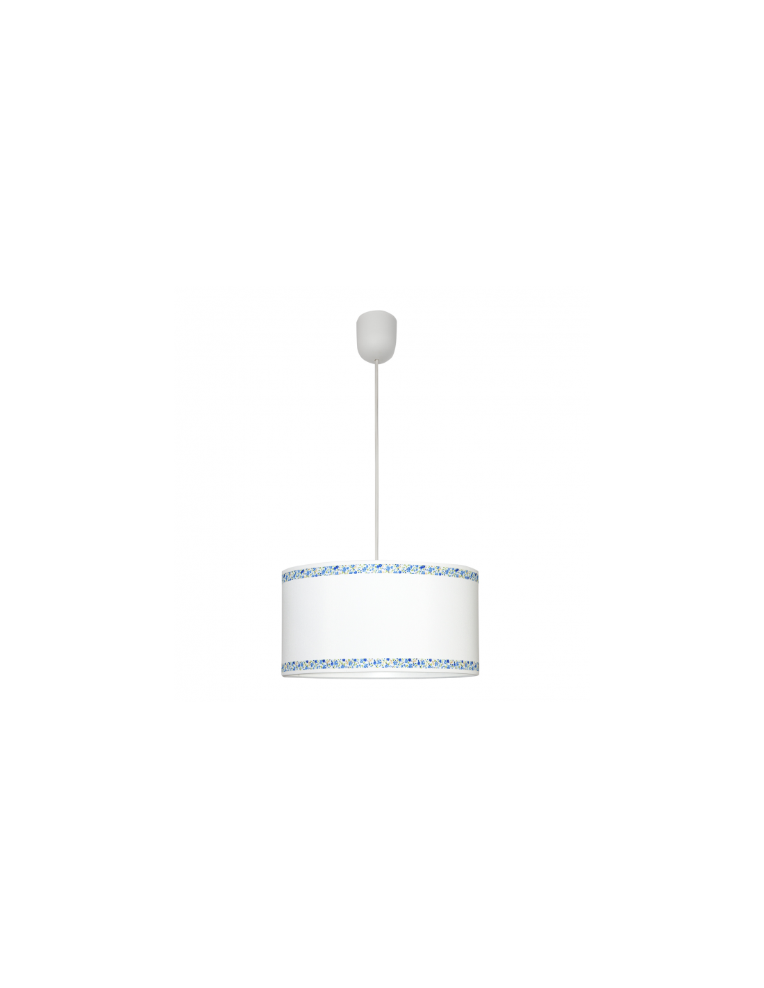 Colgante serie CENEFA de color blanco con detalles en azul. Tiene un diámetro de 35 cm y una altura regulable. La pantalla se caracteriza por dos cenefas decorativos con motivos florales en tonos azules y verdes. Portalámparas E27.