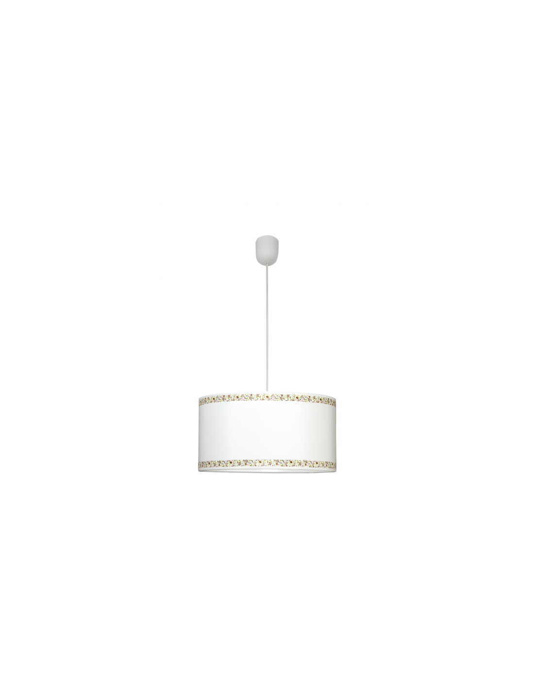 Colgante serie CENEFA de color blanco con detalles en marrón. Tiene un diámetro de 35 cm y una altura regulable. La pantalla se caracteriza por dos cenefas decorativos con motivos florales en tonos marrones, rosas y verdes. Portalámparas E27.