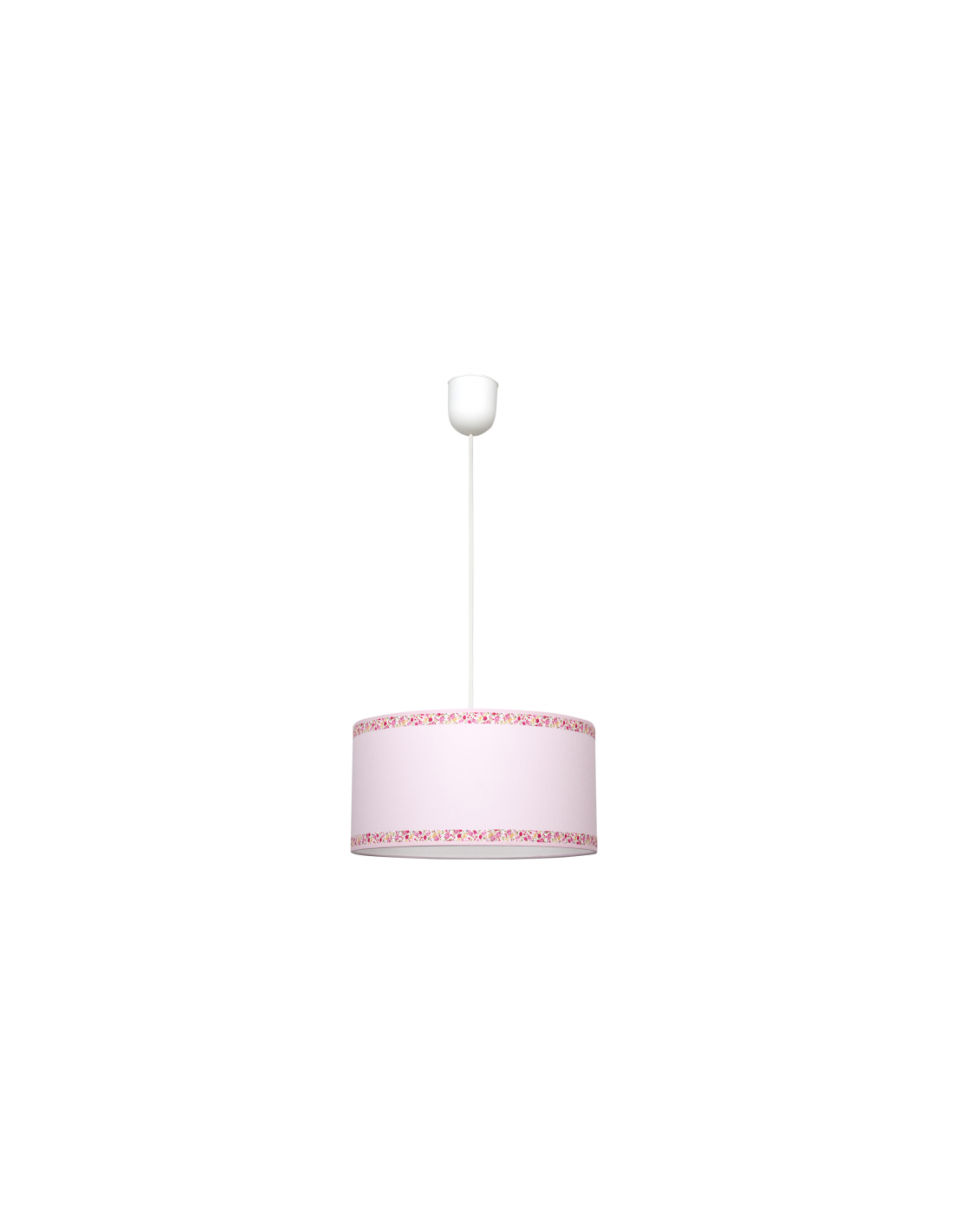 Colgante serie CENEFA color rosa. Tiene un diámetro de 35 cm y una altura regulable. La pantalla se caracteriza por dos cenefas decorativos con motivos florales en tonos rosas y verdes. Portalámparas E27.