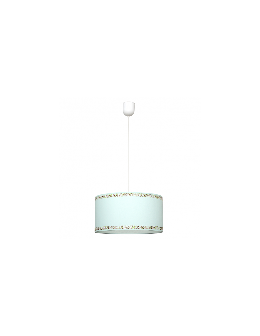Colgante serie CENEFA color verde agua. Tiene un diámetro de 35 cm y una altura regulable. La pantalla se caracteriza por dos cenefas decorativos con motivos florales en tonos verdes, marrones y rosas. Portalámparas E27.