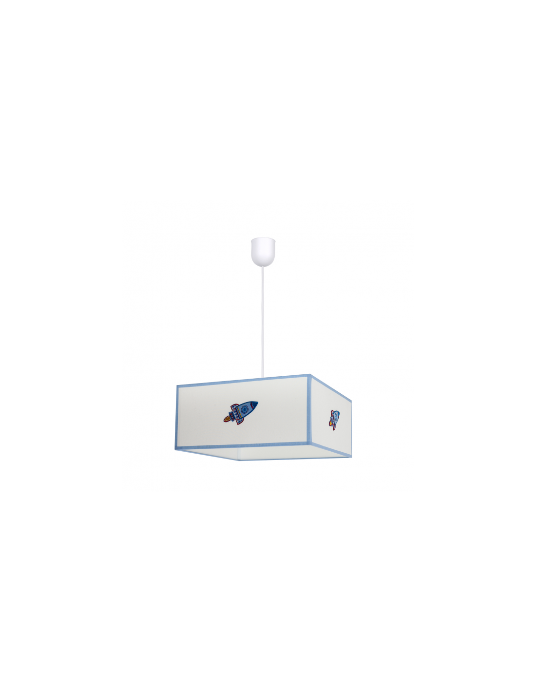 Colgante infantil serie Cohete de color blanco/azul. Realizado en material textil, destaca por su forma cuadrada y el motivo bordado en forma de cohete. Sus dimensiones son 35x35 cm, la altura de la pantalla son 16 cm y su altura total regulable. Portalámparas E27. Puede completar la serie con el sobremesa.