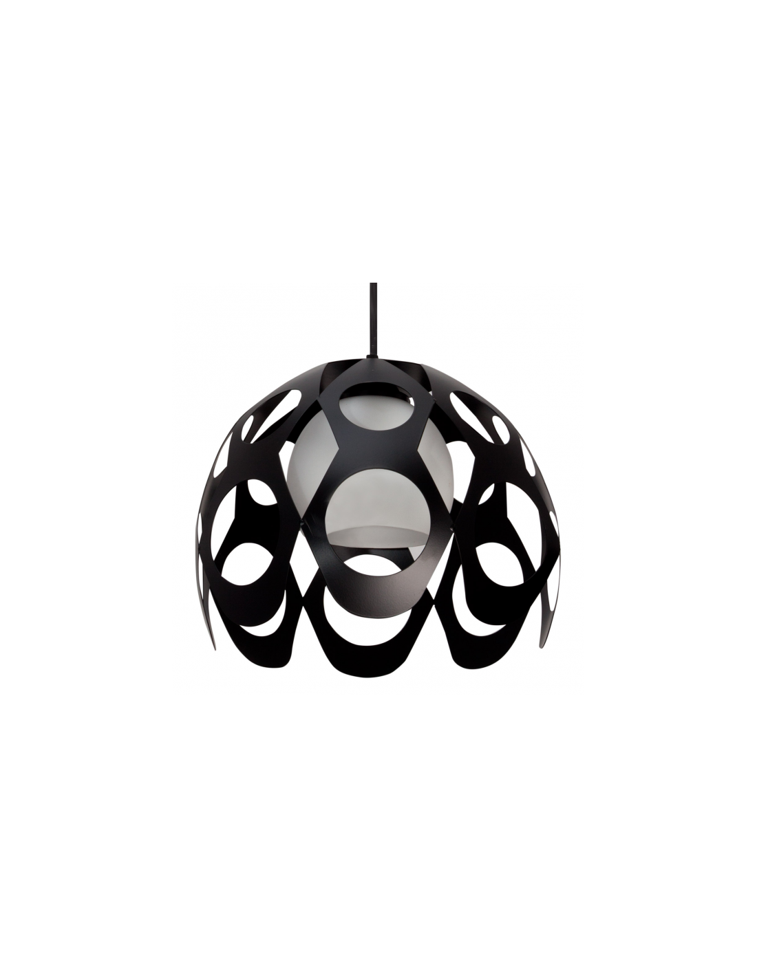 Colgante Serie CREPÚSCULO en color negro. Realizado en policarbonato y pequeña pantalla en cristal. El calado de la pantalla ofrece un juego de luces muy peculiar. El porta lámparas es E27.