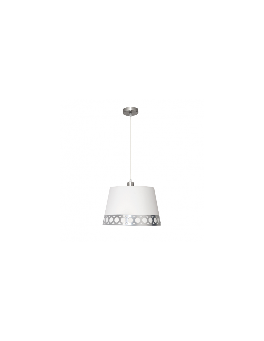 Colgante serie Dalia de color blanco/plata. Está realizado en metal y material textil, con cenefa decorativa de motivos circulares. La familia se puede completar con el sobremesa, pie de salón y lámpara de tres y dos luces. Disponible también en color blanco/oro. Posee un portalámparas E27.