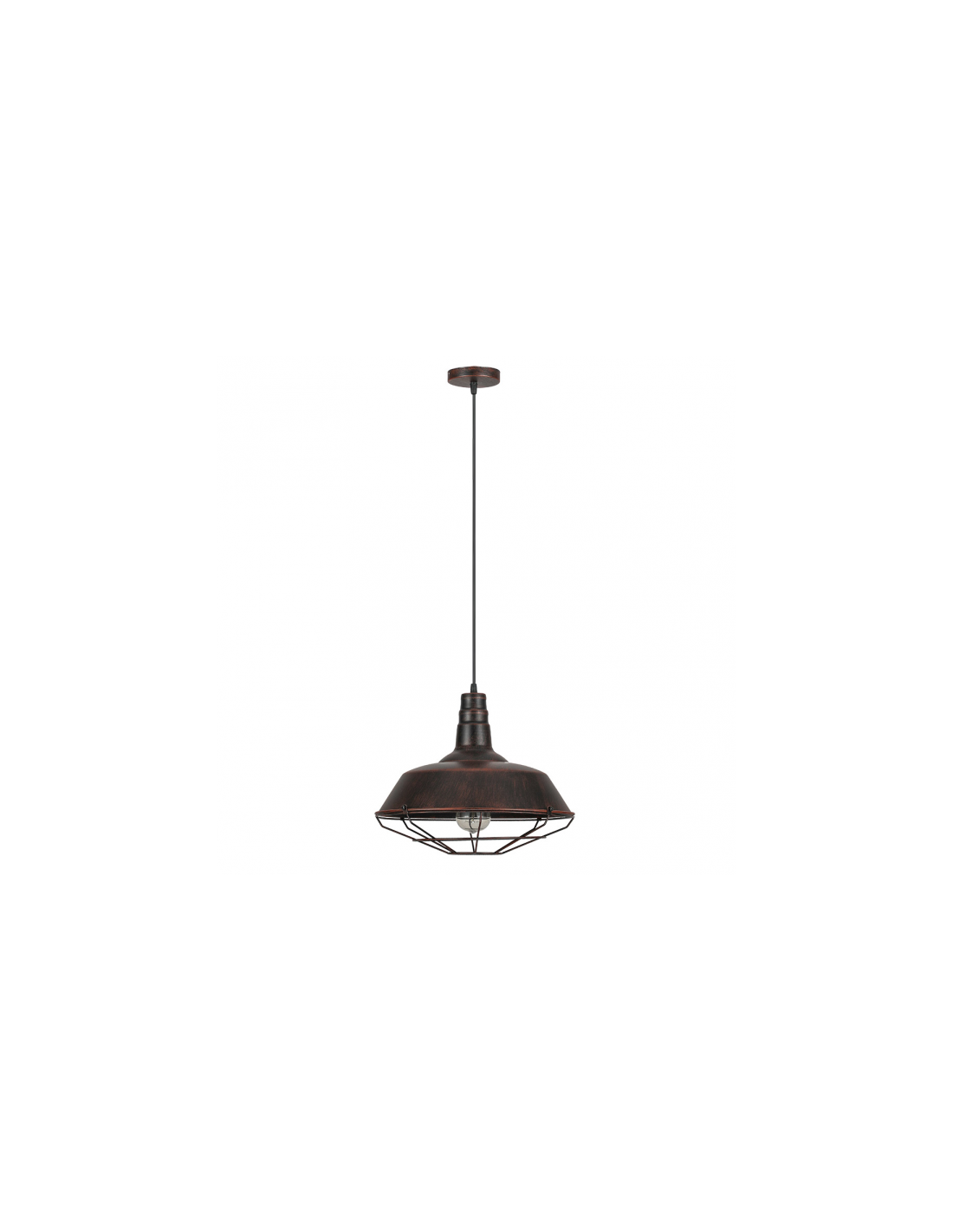 Colgante serie FLAMENCO de metal color MARRON OXIDO con rejilla protegiendo la bombilla, de estilo Industrial Retro. Regulable en altura tiene un diámetro de 36 centímetros. Trae un portalámpara E27. Bombilla no incluida. Se recomienda completar con bombilla estilo vintage para conservar su estética. Disponible también en color Negro y Rústico/Plata.