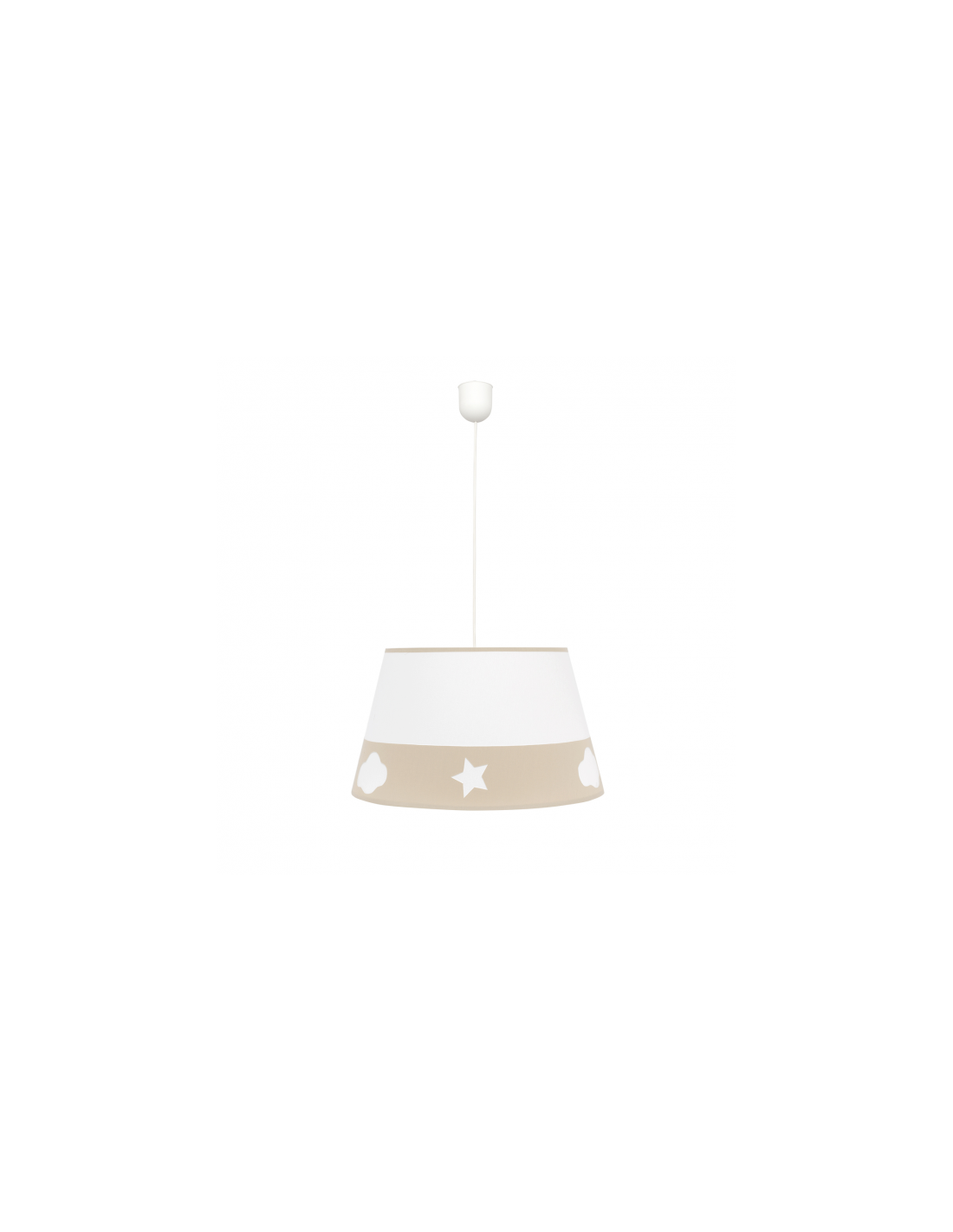 Colgante serie Galaxia en color blanco/piedra. Realizado en material textil. Portalámparas E27. Su diámetro es de 35 cm. Su diseño presenta una cenefa de color celeste decorada con motivos de estrellas y nubes. Disponible en verde agua, rosa, lila y celeste.