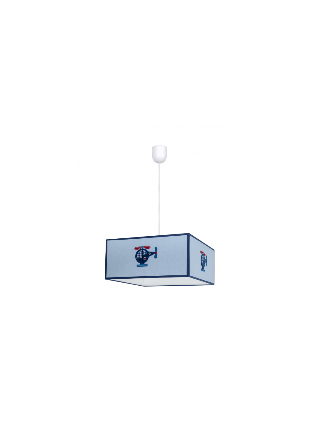 Colgante infantil serie Helicóptero de color celeste. Realizado en material textil, destaca por su forma cuadrada y el motivo bordado en forma de cohete. Sus dimensiones son 35x35 cm, la altura de la pantalla son 16 cm y su altura total regulable. Portalámparas E27. Puede completar la serie con el sobremesa.
