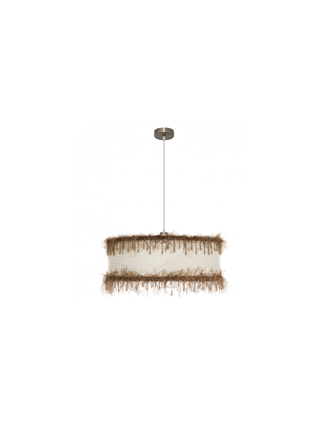 Colgante serie Hilos de color beis. Este moderno colgante se caracteriza por una decoración de pasamanería de color ocre. Pantalla y armazón componen un conjunto perfecto para ambientar espacios con cierto toque vintage. Posee un portalámparas E27 y su diámetro es de 50 centímetros. Se puede completar la serie con el colgante de 40 cm y el sobremesa a juego.