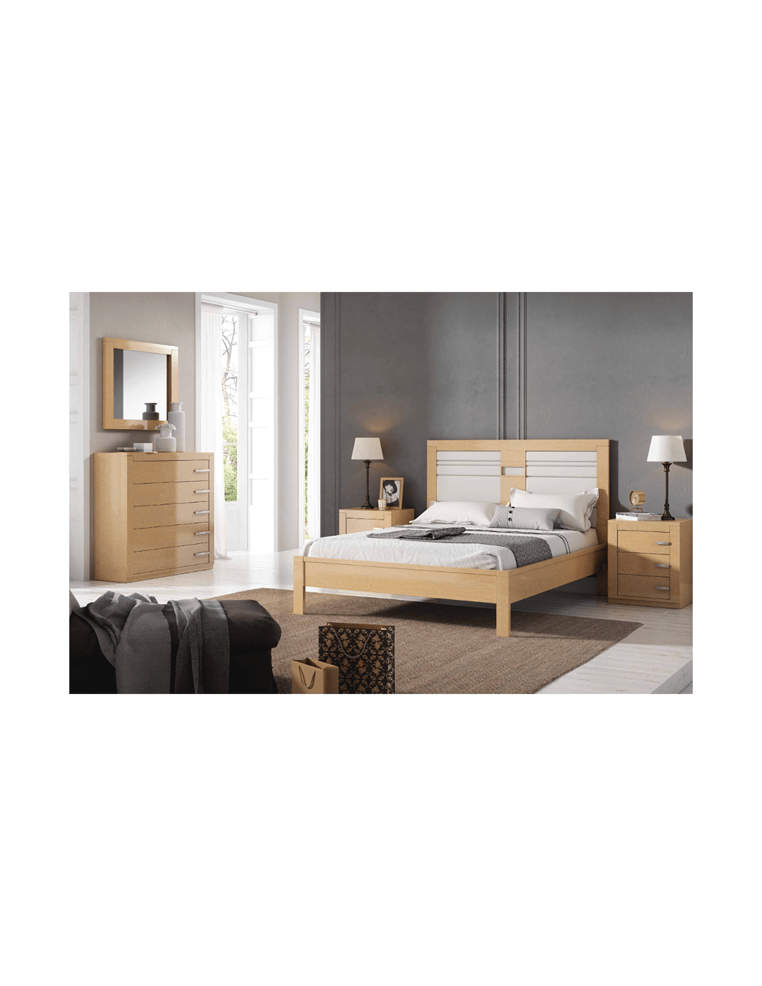 Composicion de dormitorio sin armario en color madera con bancada