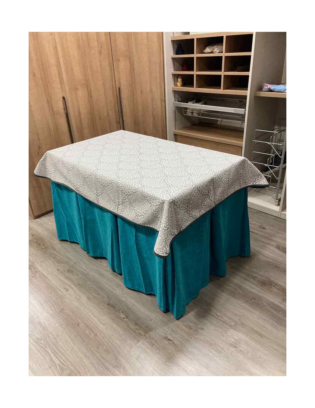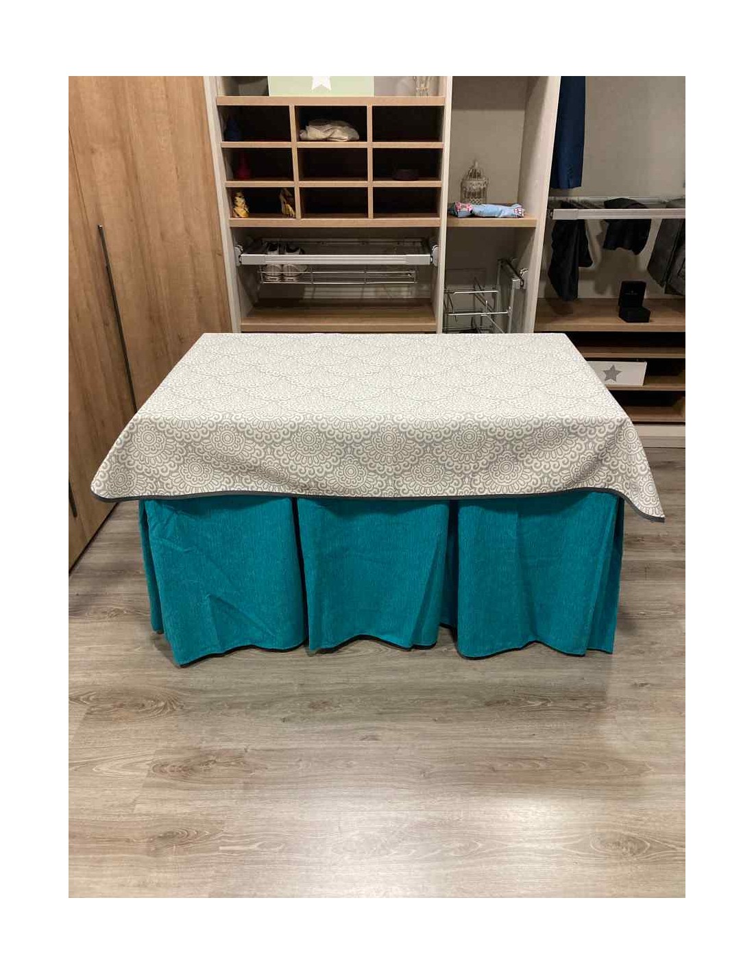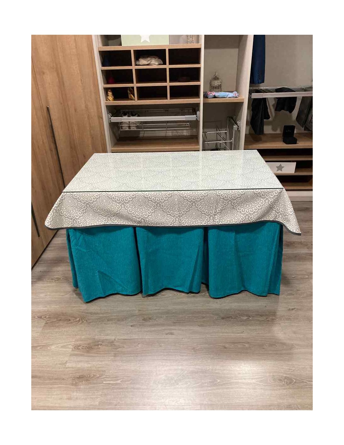 Confeccionada con 8 pliegues para mantener el calor de manera eficiente. Las tablas comunmente llamados pliegues, favorecen la retención de la temperatura impidiendo escapar el calor cuando nos sentamos en la mesa y nos cubrimos con ella. Gracias a nuestro diseño en los fuelles la falda de mesa camilla caerá cubriéndono los laterales e impidiendo que escape el calor.
