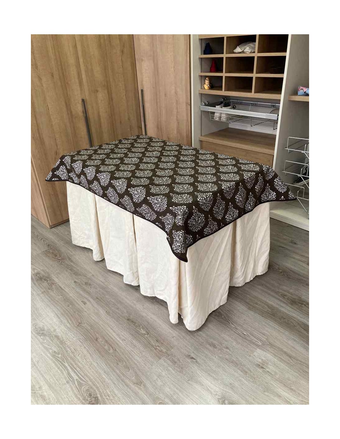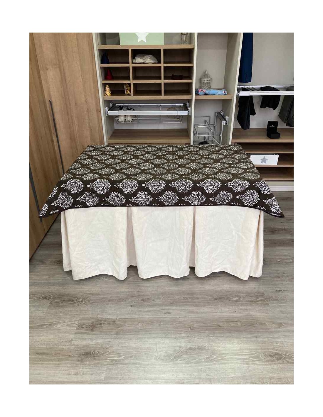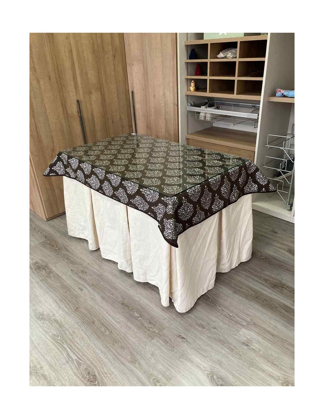 Confeccionada con 8 pliegues para mantener el calor de manera eficiente. Las tablas comunmente llamados pliegues, favorecen la retención de la temperatura impidiendo escapar el calor cuando nos sentamos en la mesa y nos cubrimos con ella. Gracias a nuestro diseño en los fuelles la falda de mesa camilla caerá cubriéndono los laterales e impidiendo que escape el calor.