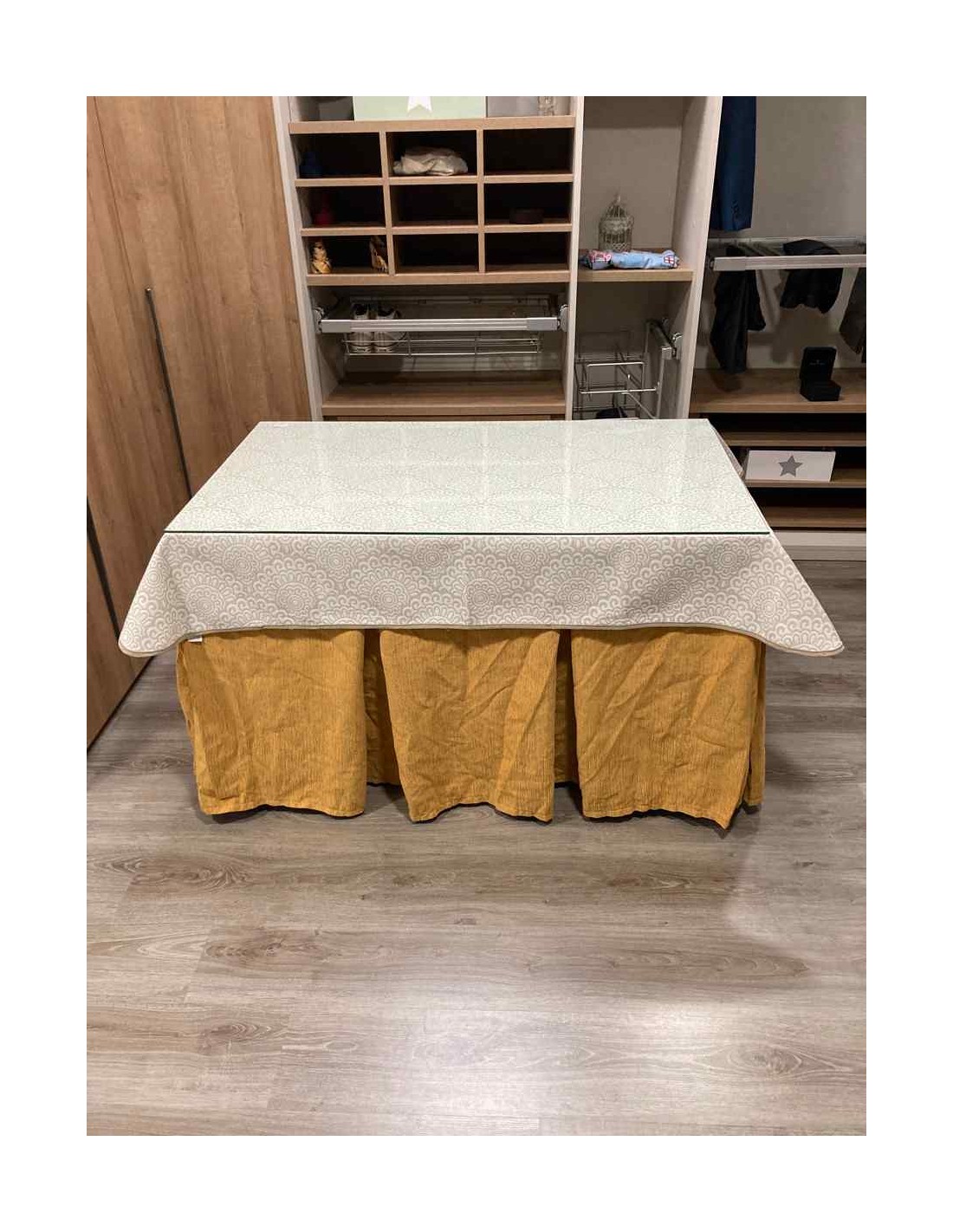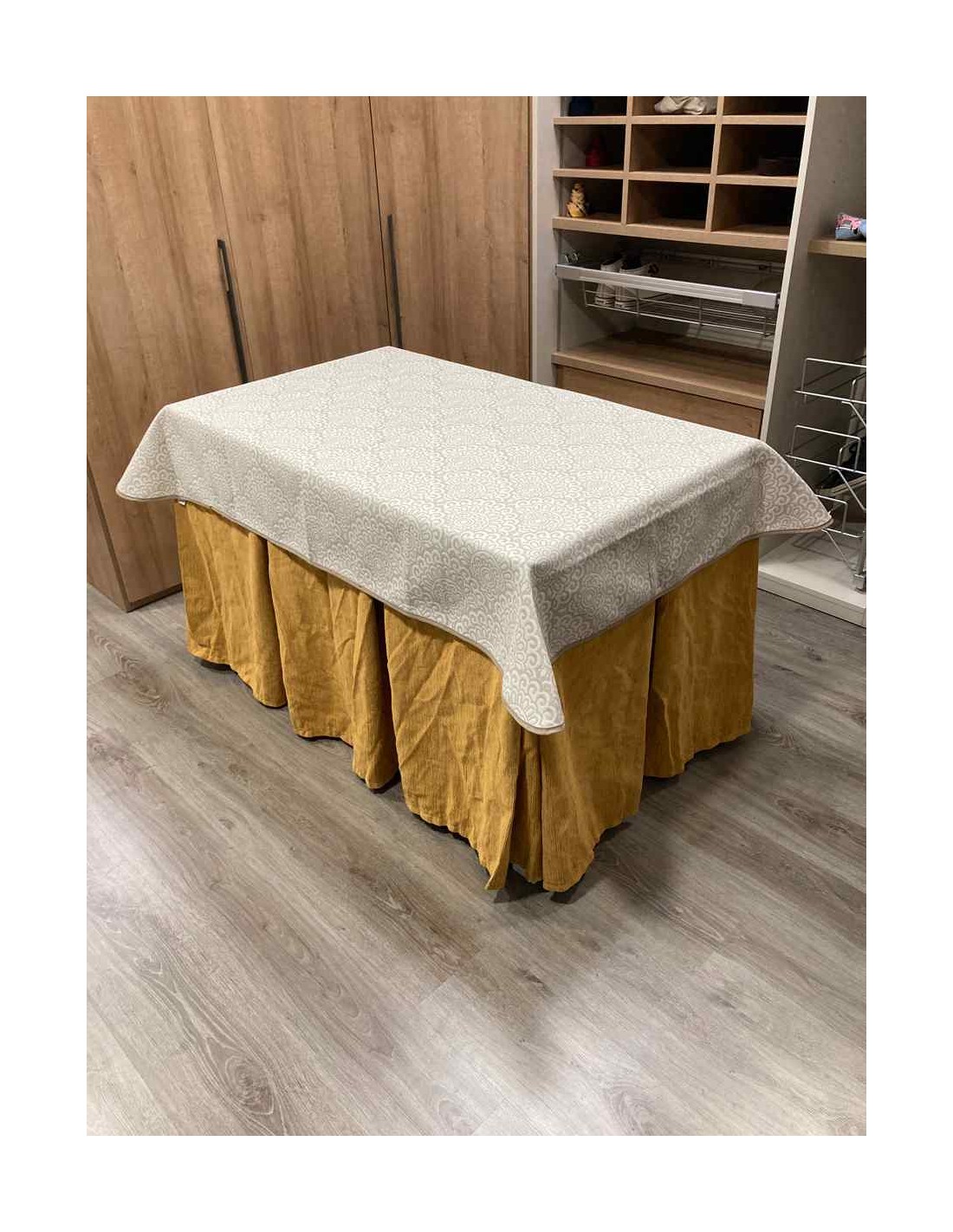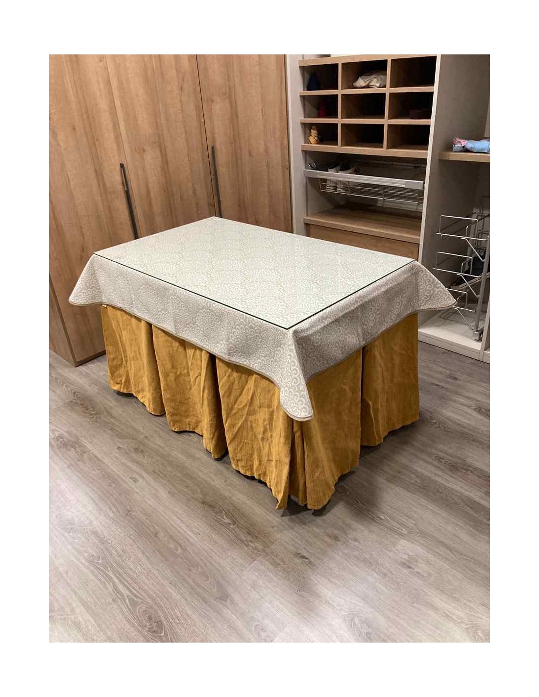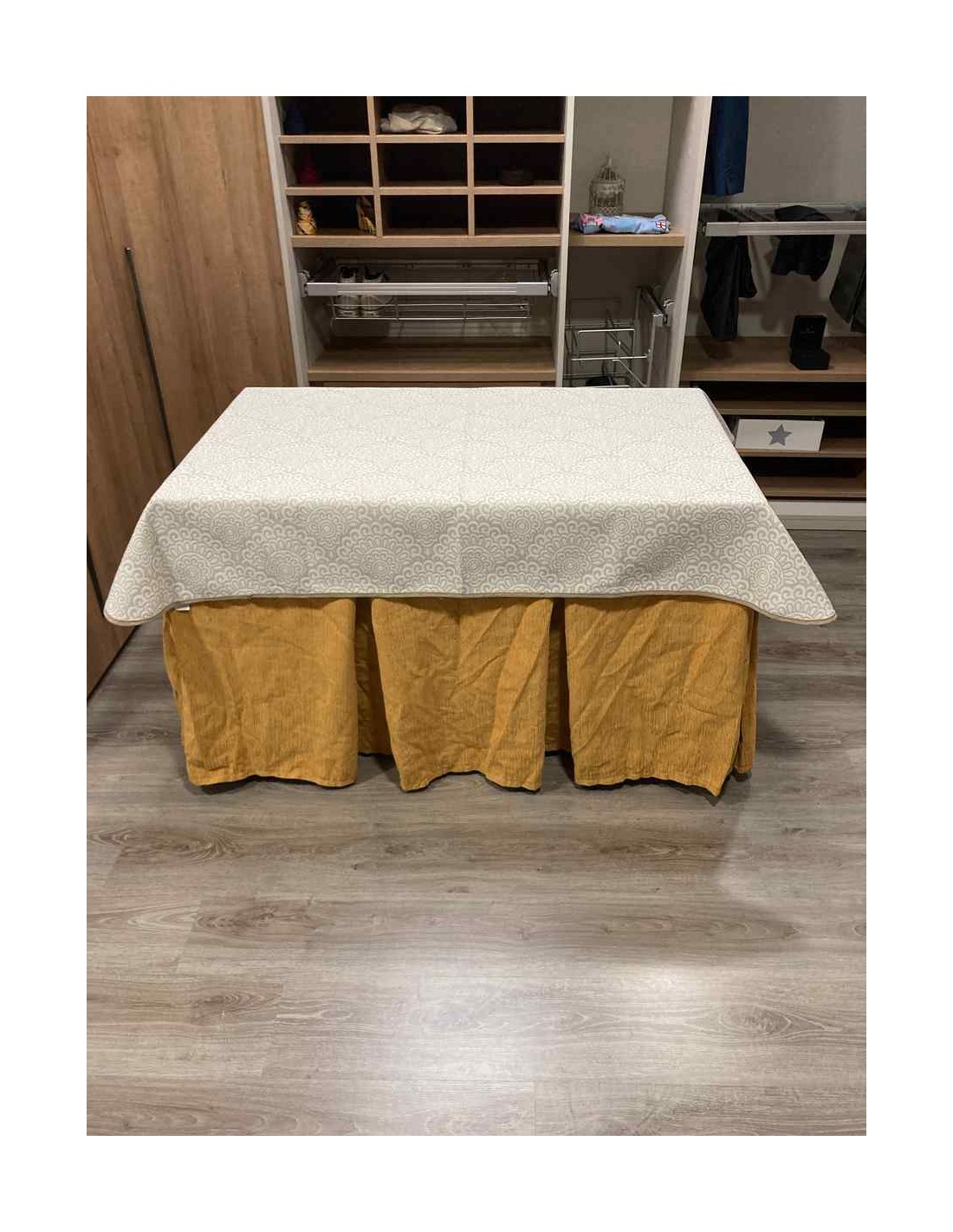Confeccionada con 8 pliegues para mantener el calor de manera eficiente. Las tablas comunmente llamados pliegues, favorecen la retención de la temperatura impidiendo escapar el calor cuando nos sentamos en la mesa y nos cubrimos con ella. Gracias a nuestro diseño en los fuelles la falda de mesa camilla caerá cubriéndono los laterales e impidiendo que escape el calor.