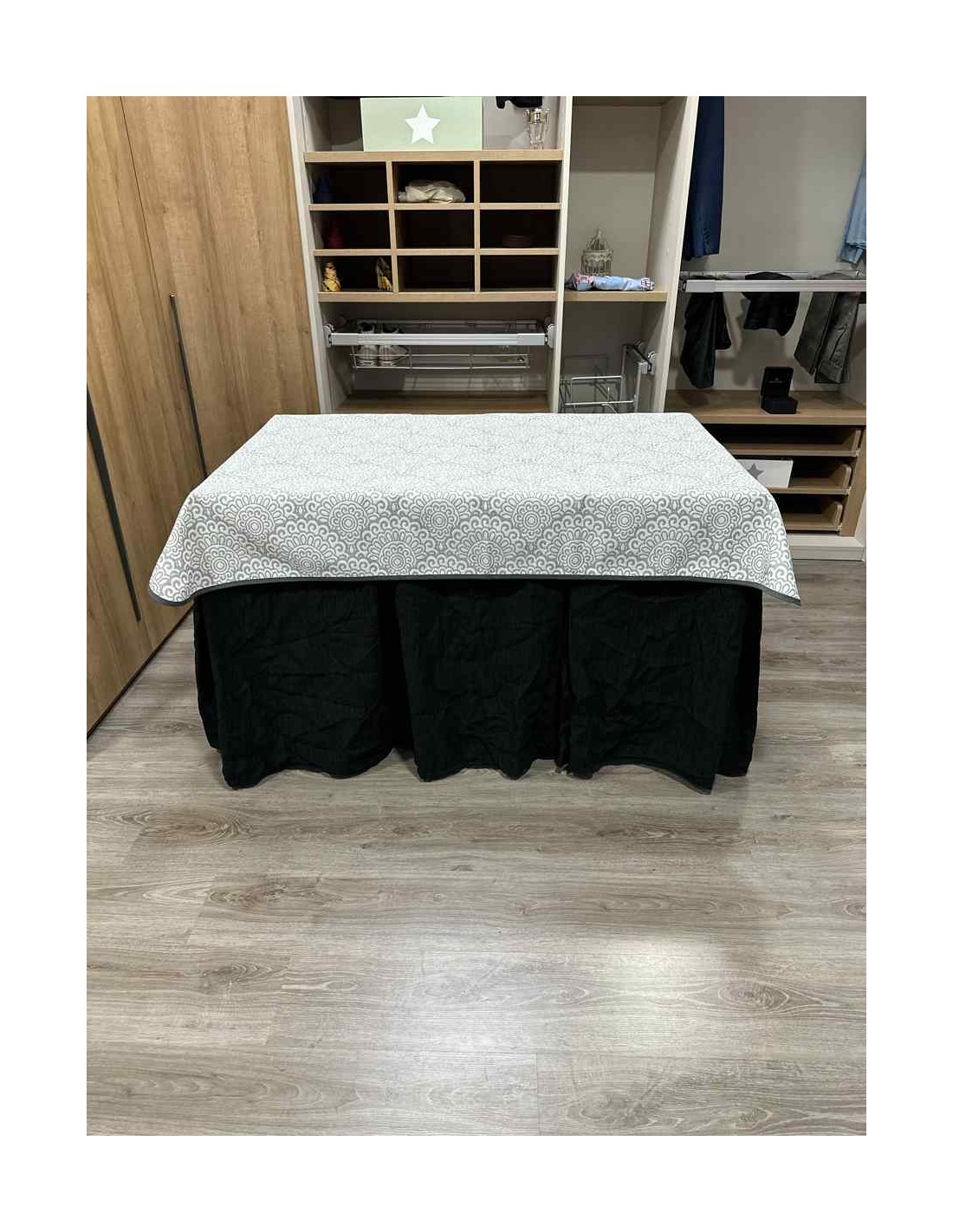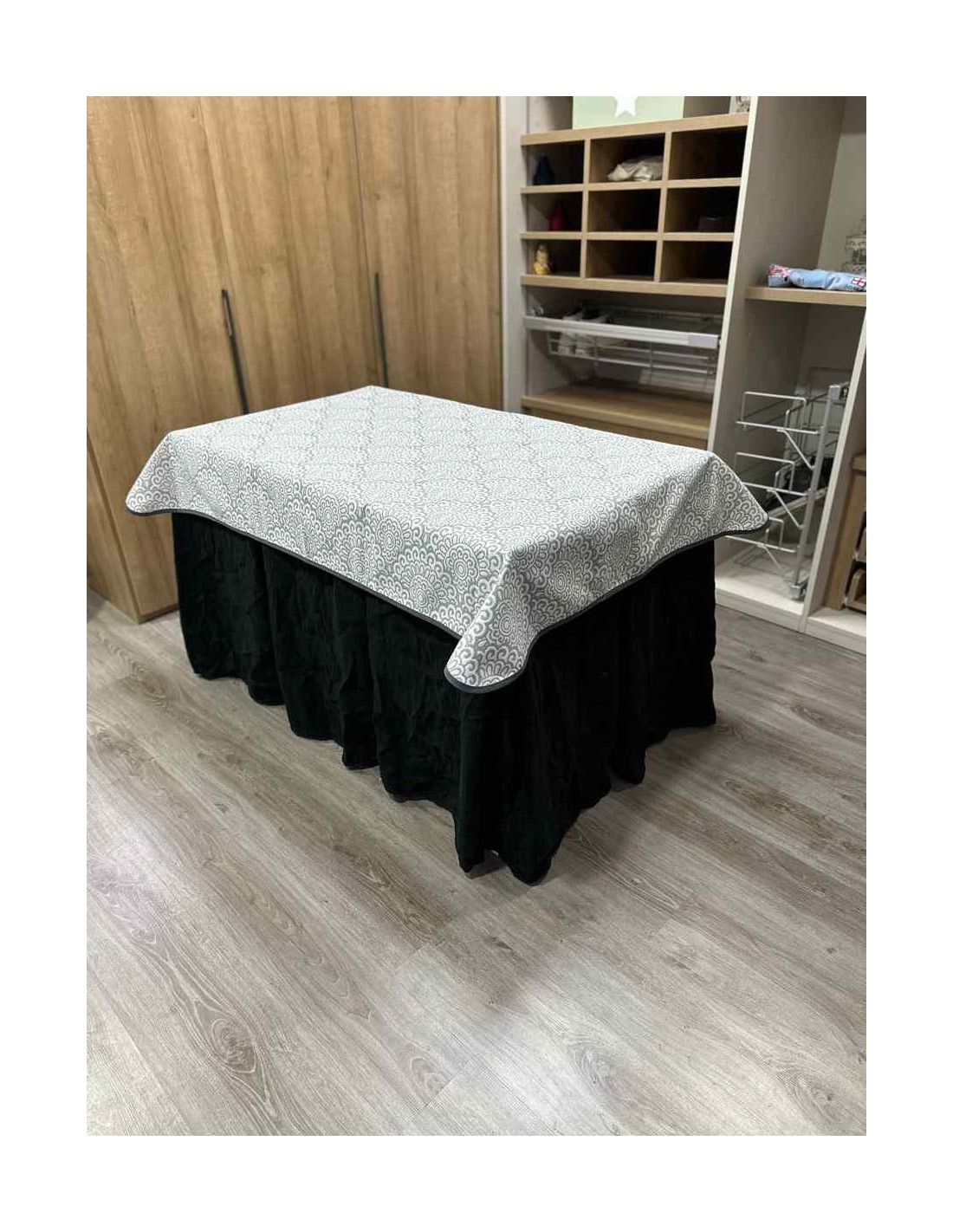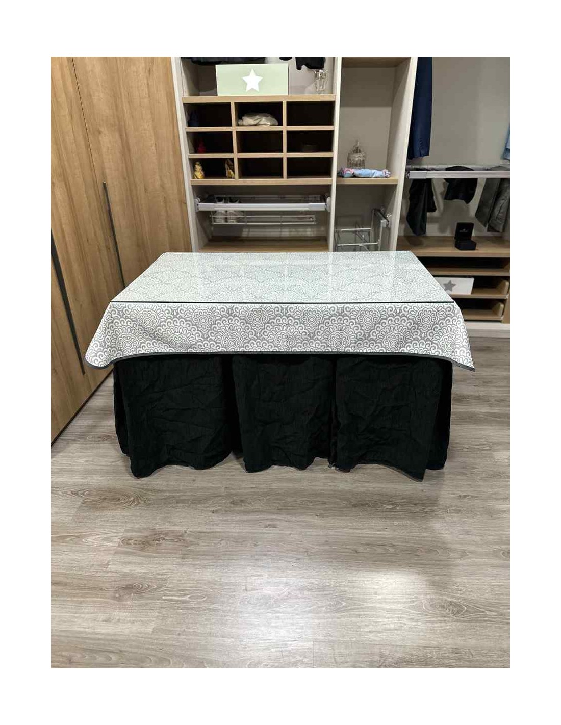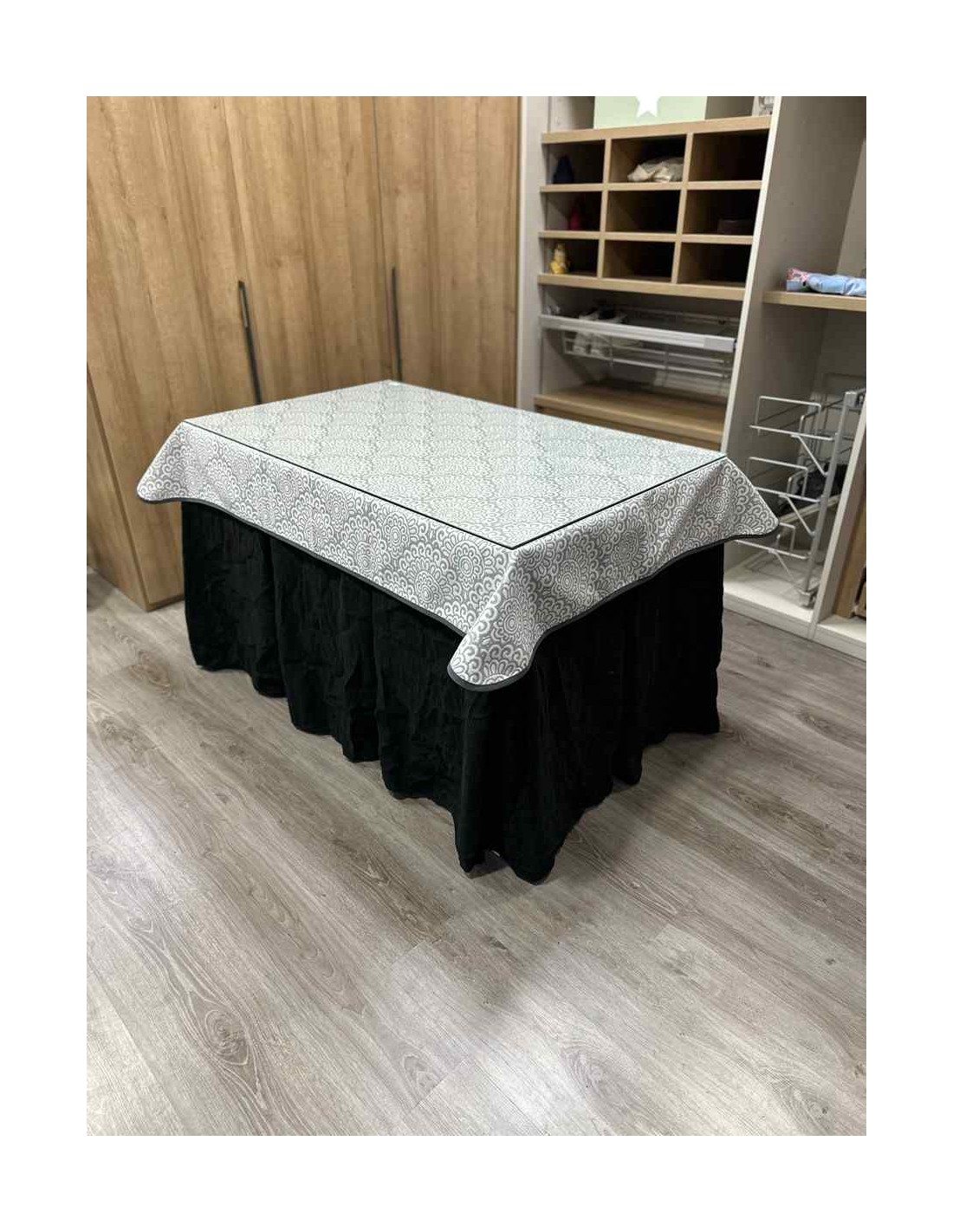 Confeccionada con 8 pliegues para mantener el calor de manera eficiente. Las tablas comunmente llamados pliegues, favorecen la retención de la temperatura impidiendo escapar el calor cuando nos sentamos en la mesa y nos cubrimos con ella. Gracias a nuestro diseño en los fuelles la falda de mesa camilla caerá cubriéndono los laterales e impidiendo que escape el calor.
