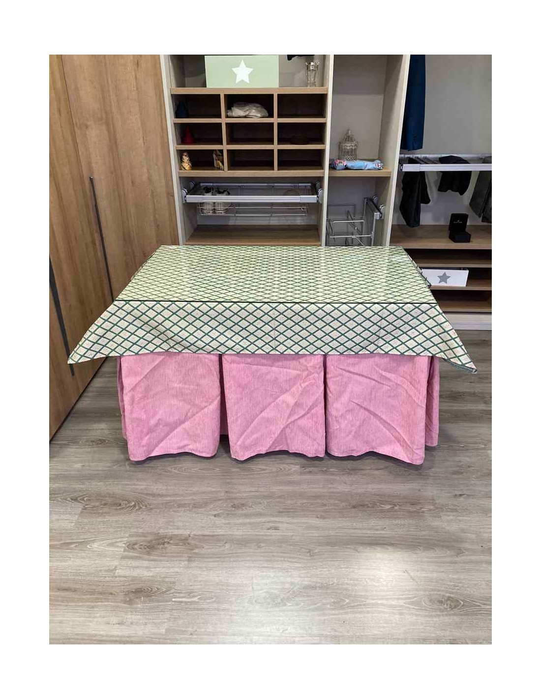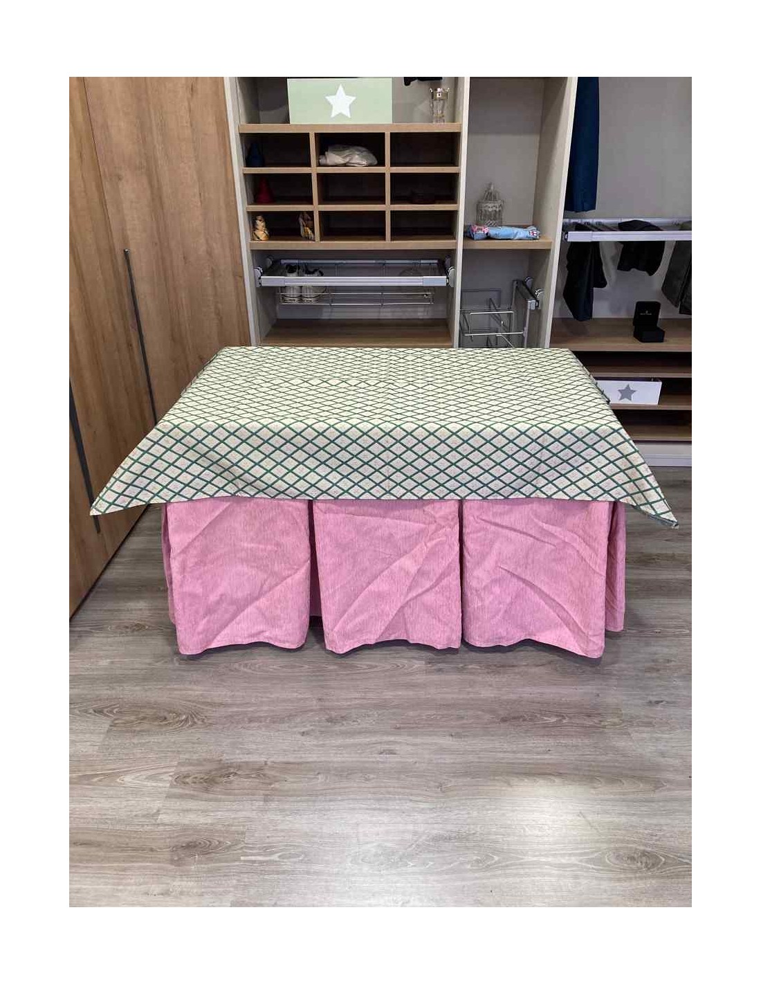Confeccionada con 8 pliegues para mantener el calor de manera eficiente. Las tablas comunmente llamados pliegues, favorecen la retención de la temperatura impidiendo escapar el calor cuando nos sentamos en la mesa y nos cubrimos con ella. Gracias a nuestro diseño en los fuelles la falda de mesa camilla caerá cubriéndono los laterales e impidiendo que escape el calor.