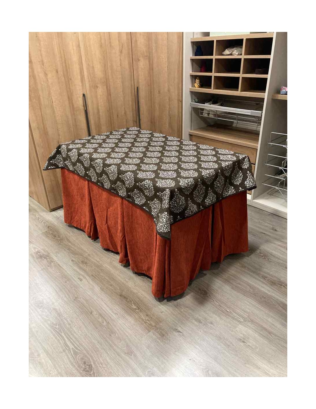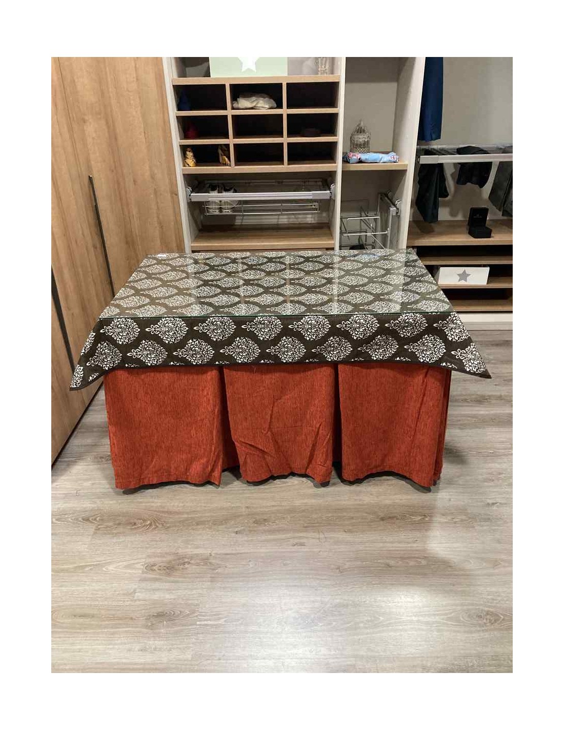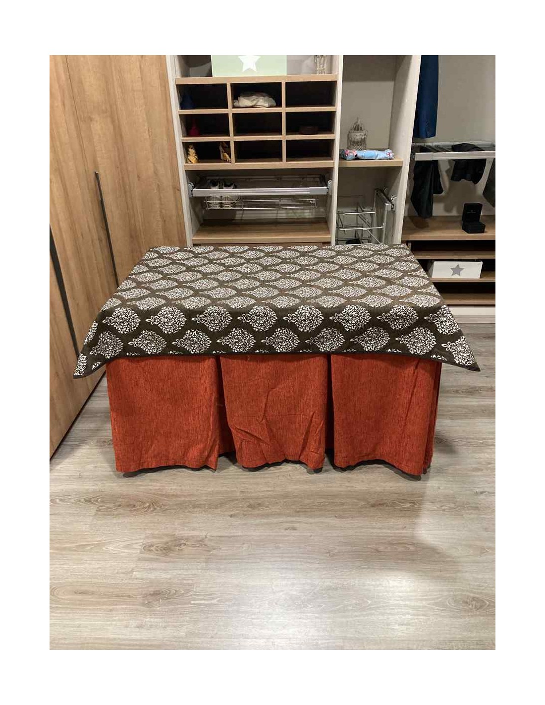 Confeccionada con 8 pliegues para mantener el calor de manera eficiente. Las tablas comunmente llamados pliegues, favorecen la retención de la temperatura impidiendo escapar el calor cuando nos sentamos en la mesa y nos cubrimos con ella. Gracias a nuestro diseño en los fuelles la falda de mesa camilla caerá cubriéndono los laterales e impidiendo que escape el calor.