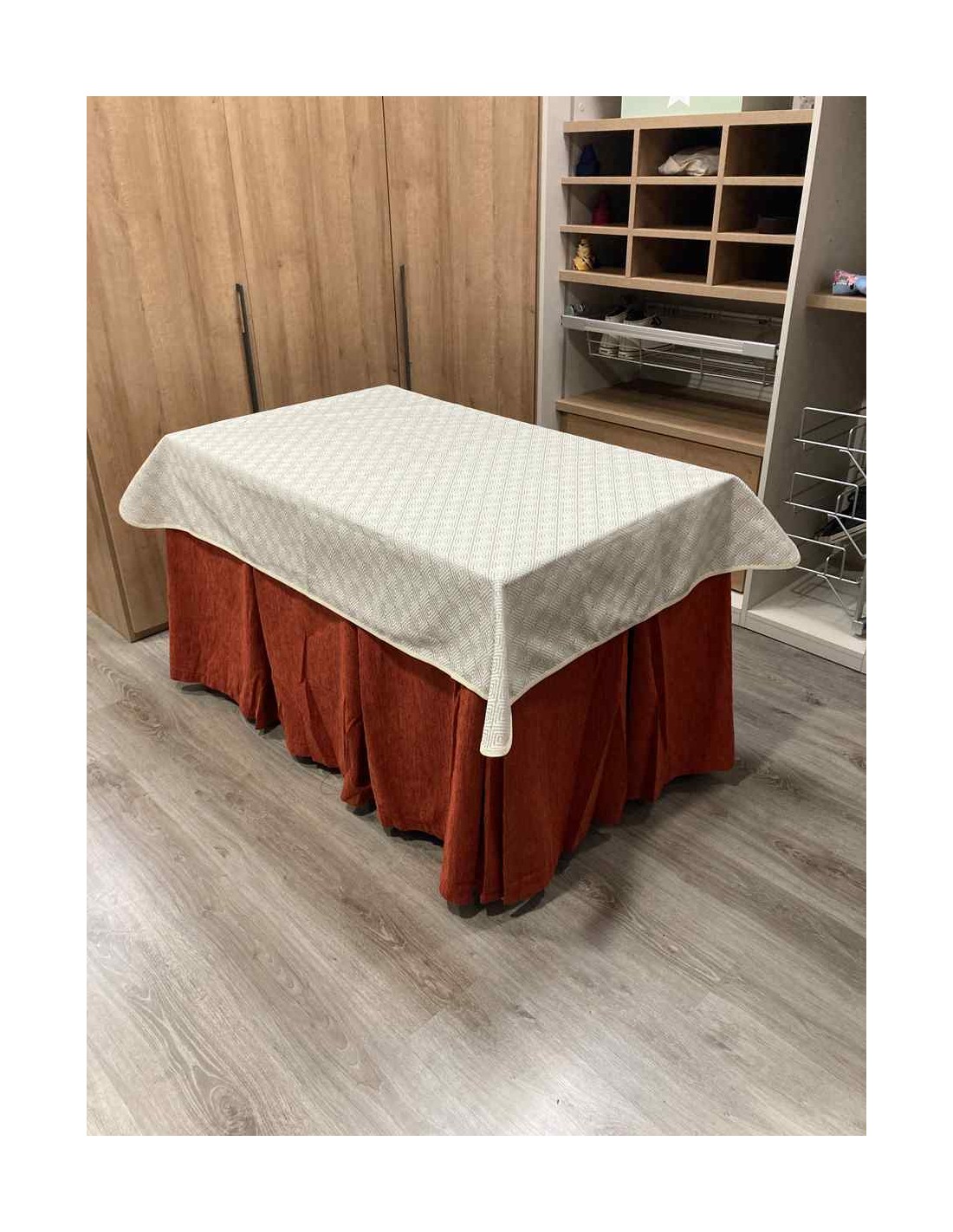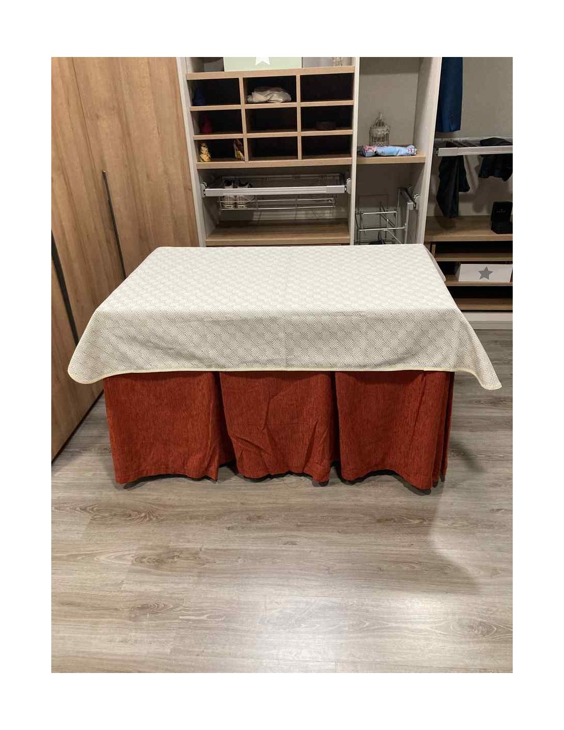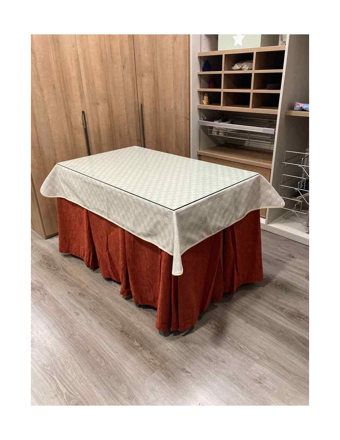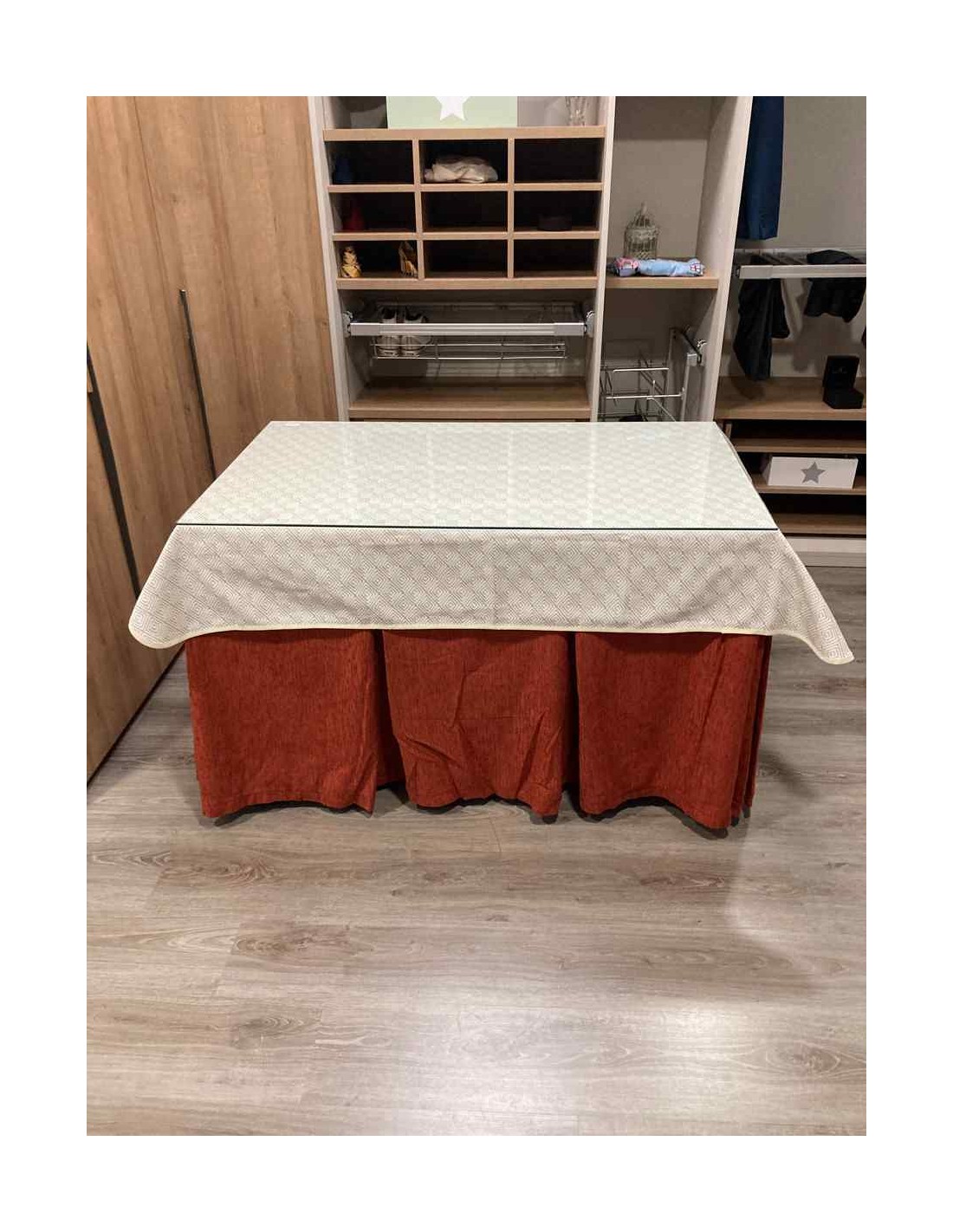 Confeccionada con 8 pliegues para mantener el calor de manera eficiente. Las tablas comunmente llamados pliegues, favorecen la retención de la temperatura impidiendo escapar el calor cuando nos sentamos en la mesa y nos cubrimos con ella. Gracias a nuestro diseño en los fuelles la falda de mesa camilla caerá cubriéndono los laterales e impidiendo que escape el calor.