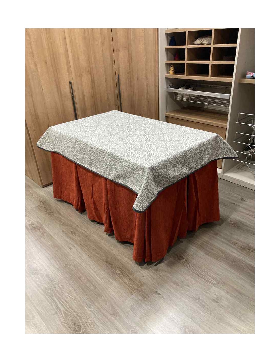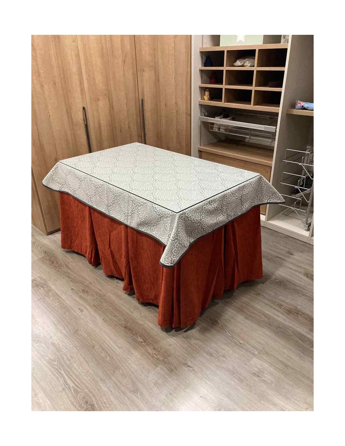 Confeccionada con 8 pliegues para mantener el calor de manera eficiente. Las tablas comunmente llamados pliegues, favorecen la retención de la temperatura impidiendo escapar el calor cuando nos sentamos en la mesa y nos cubrimos con ella. Gracias a nuestro diseño en los fuelles la falda de mesa camilla caerá cubriéndono los laterales e impidiendo que escape el calor.