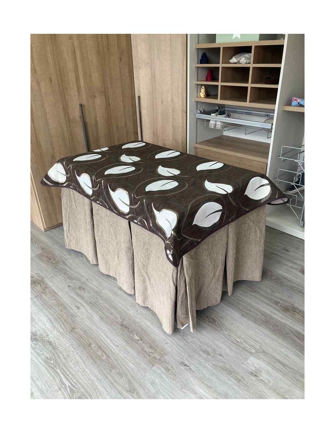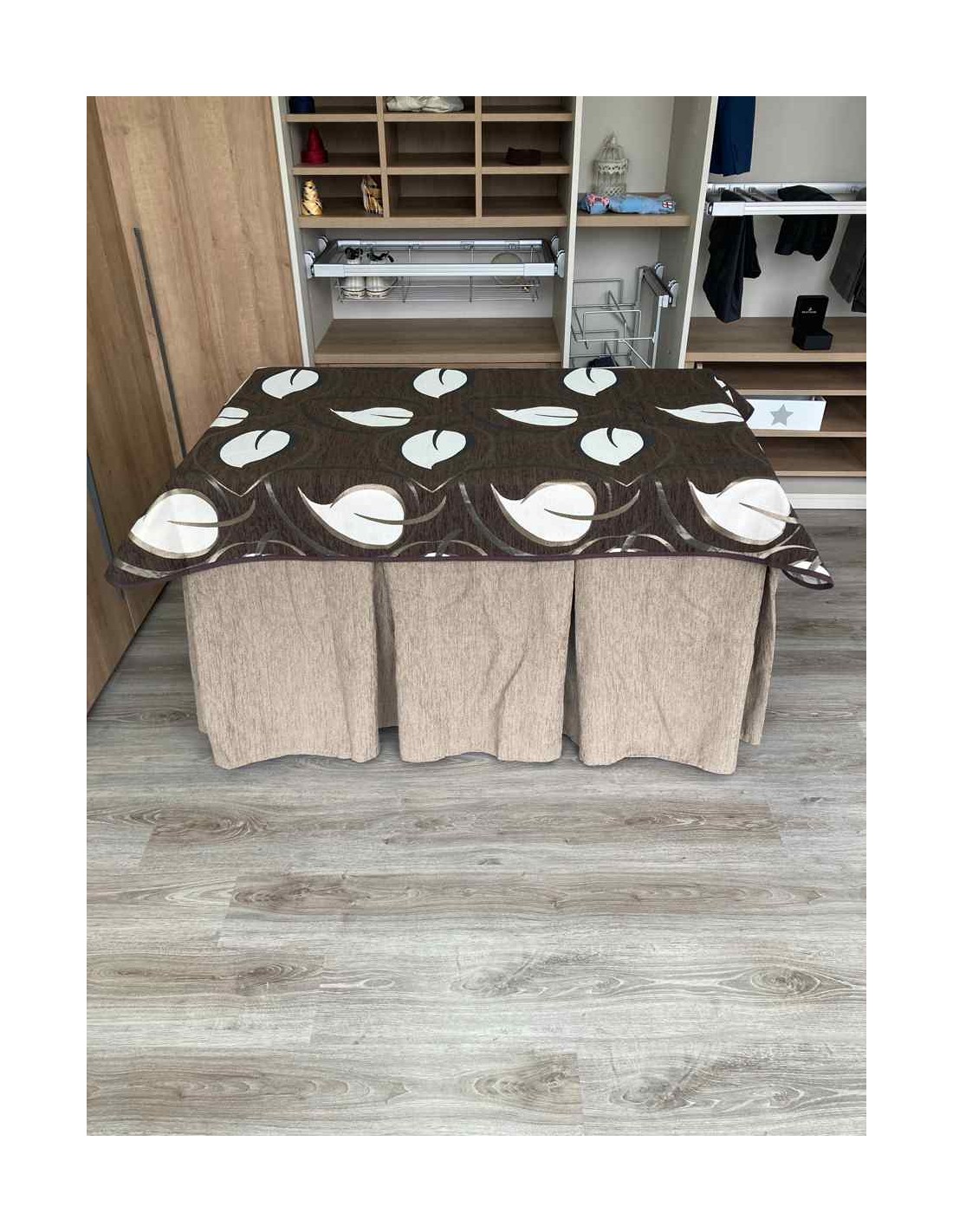 Confeccionada con 8 pliegues para mantener el calor de manera eficiente. Las tablas comunmente llamados pliegues, favorecen la retención de la temperatura impidiendo escapar el calor cuando nos sentamos en la mesa y nos cubrimos con ella. Gracias a nuestro diseño en los fuelles la falda de mesa camilla caerá cubriéndono los laterales e impidiendo que escape el calor.