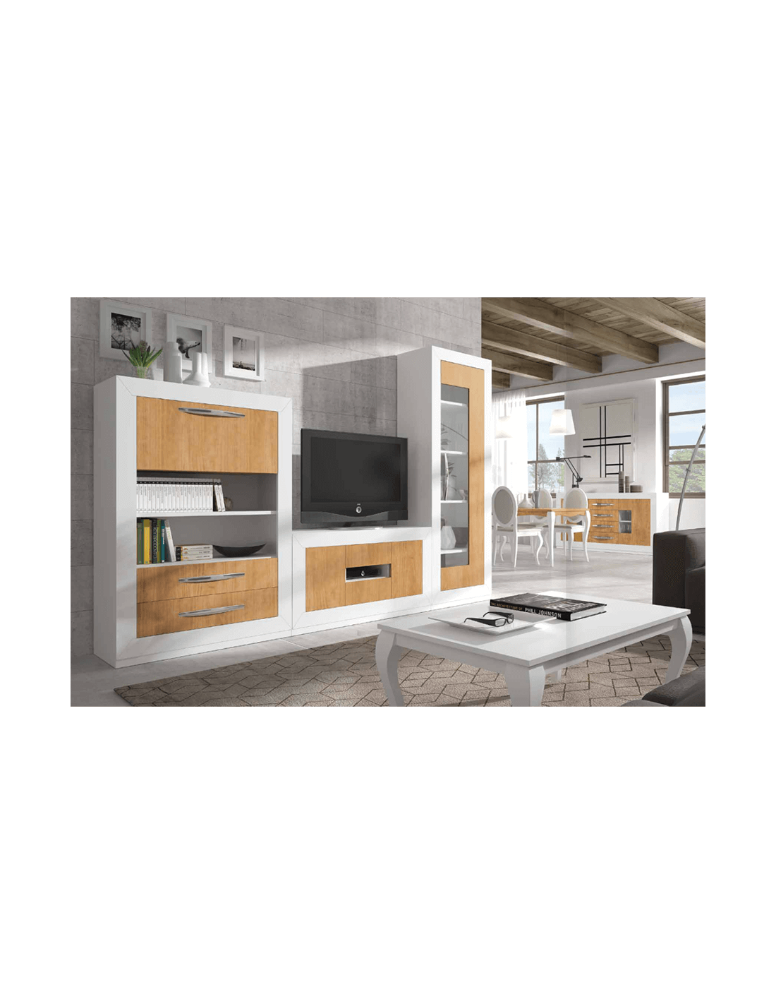 Conjunto de salon completo con vitrina y bodeguero bicolor madera con blanco
