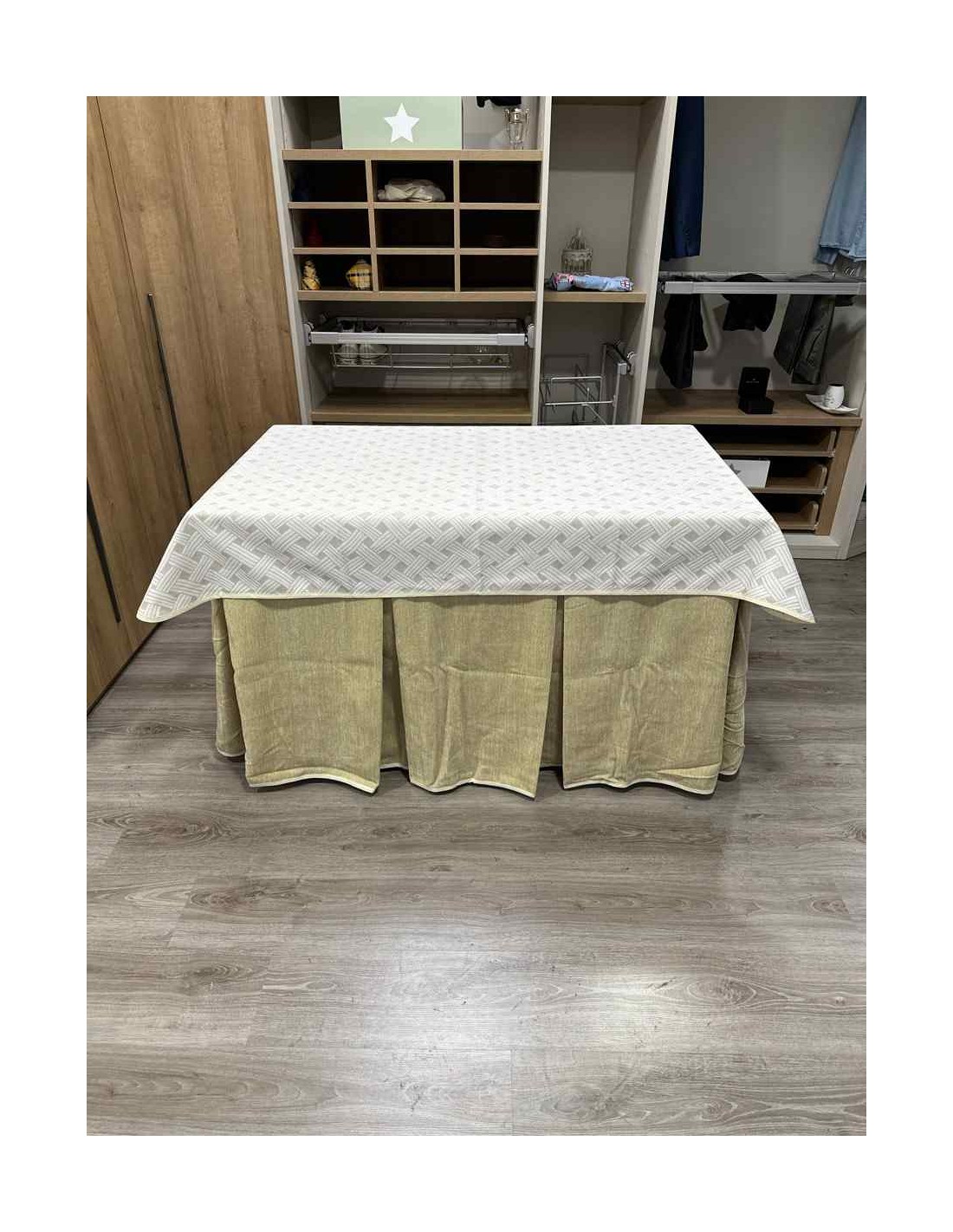Confeccionada con 10 pliegues para mantener el calor de manera eficiente. Las tablas comunmente llamados pliegues, favorecen la retención de la temperatura impidiendo escapar el calor cuando nos sentamos en la mesa y nos cubrimos con ella. Gracias a nuestro diseño en los fuelles la falda de mesa camilla caerá cubriéndono los laterales e impidiendo que escape el calor.