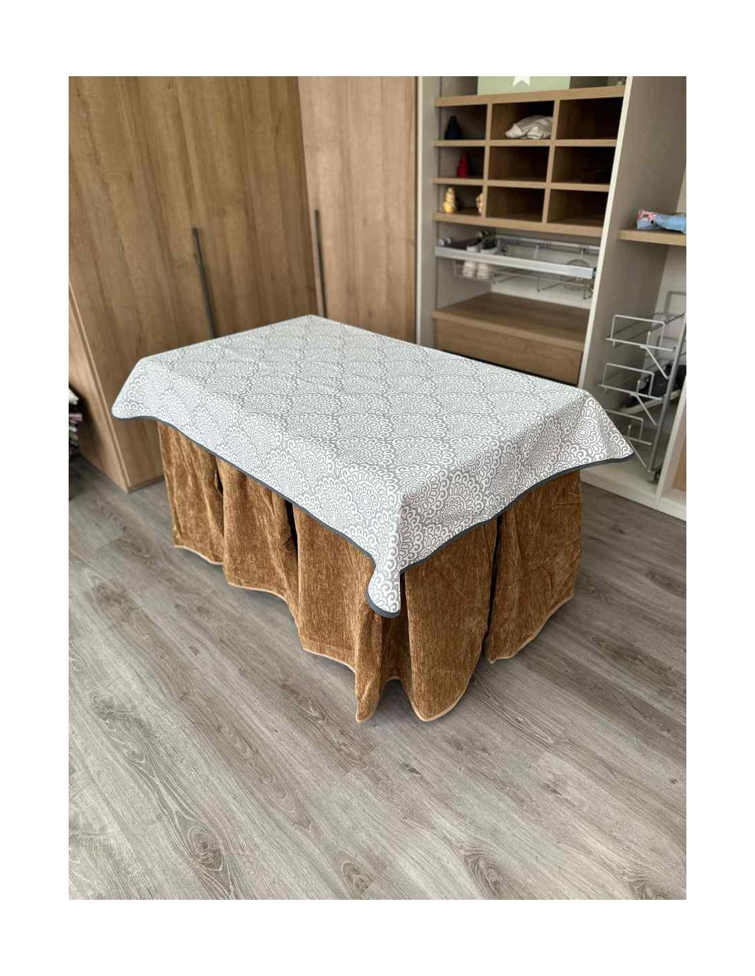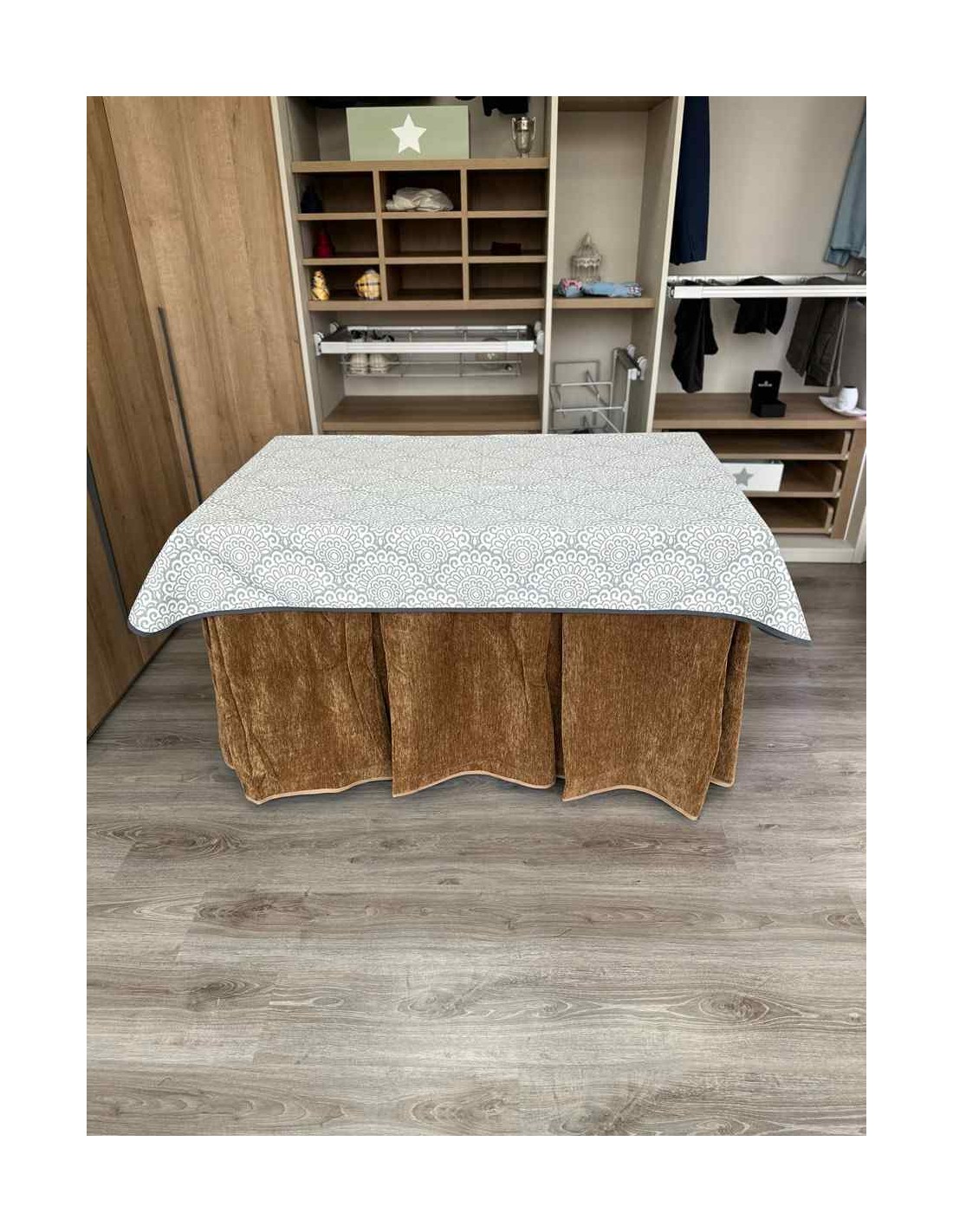 Confeccionada con 10 pliegues para mantener el calor de manera eficiente. Las tablas comunmente llamados pliegues, favorecen la retención de la temperatura impidiendo escapar el calor cuando nos sentamos en la mesa y nos cubrimos con ella. Gracias a nuestro diseño en los fuelles la falda de mesa camilla caerá cubriéndono los laterales e impidiendo que escape el calor.