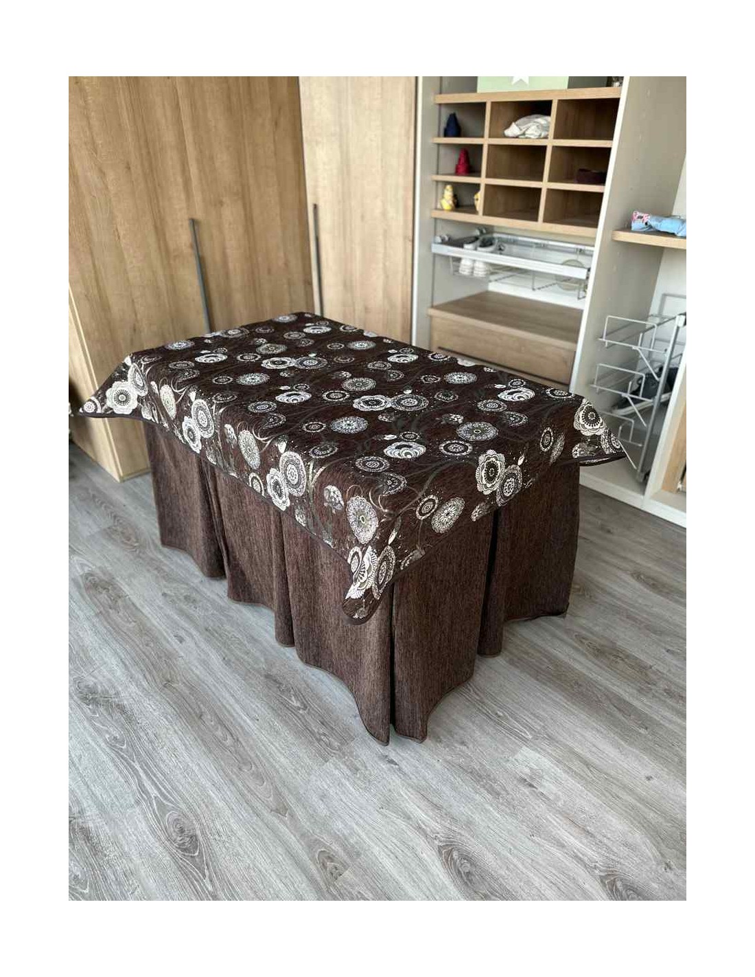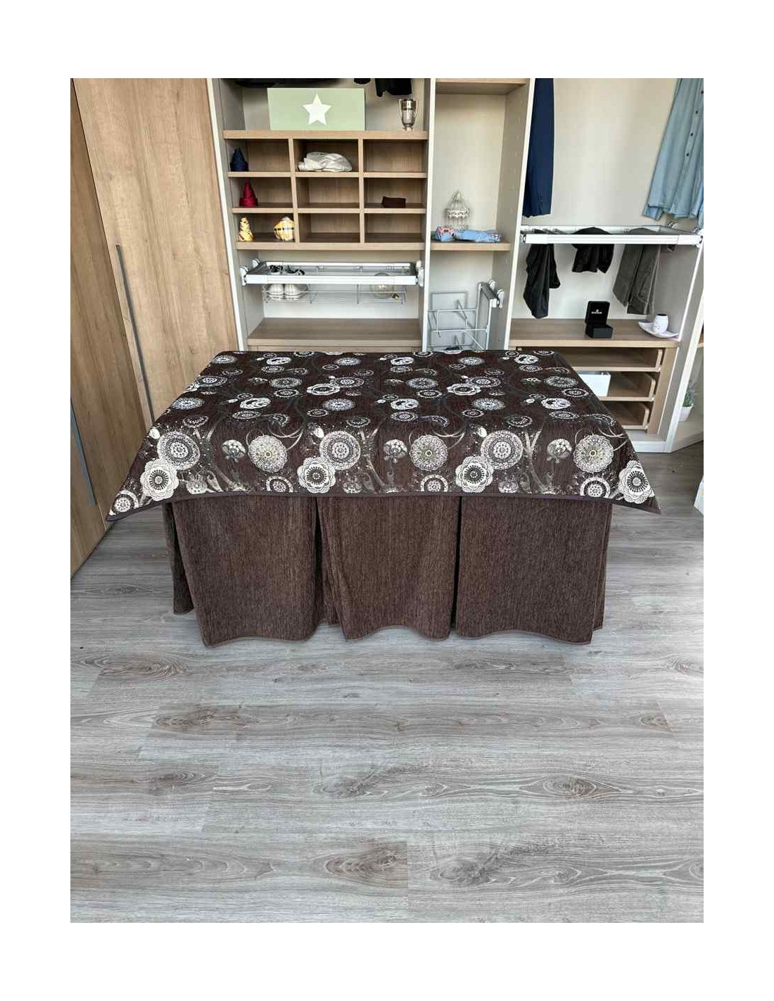 Confeccionada con 10 pliegues para mantener el calor de manera eficiente. Las tablas comunmente llamados pliegues, favorecen la retención de la temperatura impidiendo escapar el calor cuando nos sentamos en la mesa y nos cubrimos con ella. Gracias a nuestro diseño en los fuelles la falda de mesa camilla caerá cubriéndono los laterales e impidiendo que escape el calor.