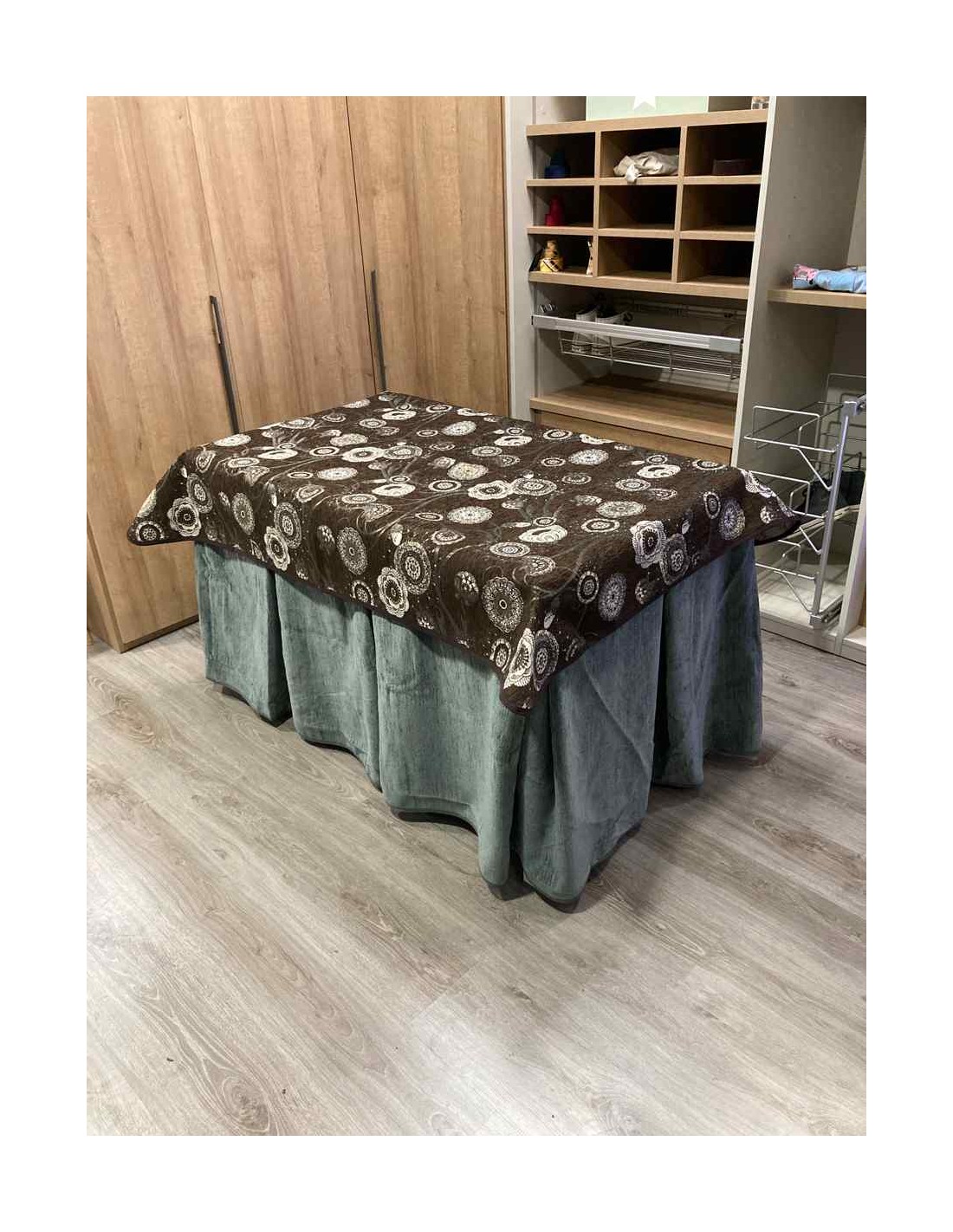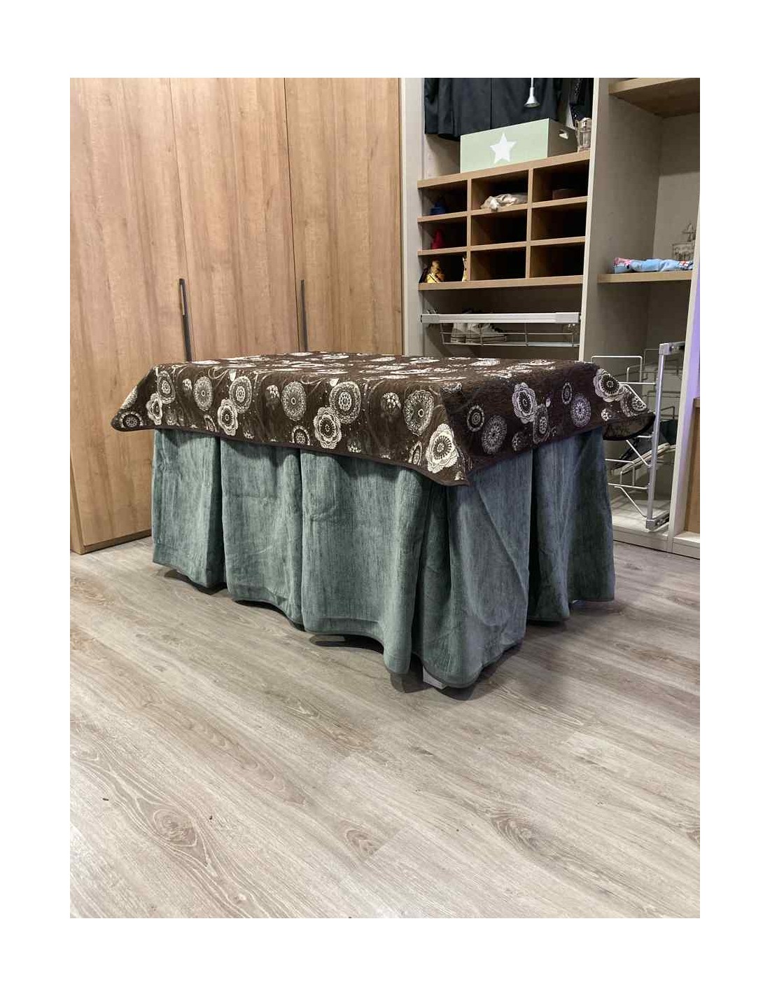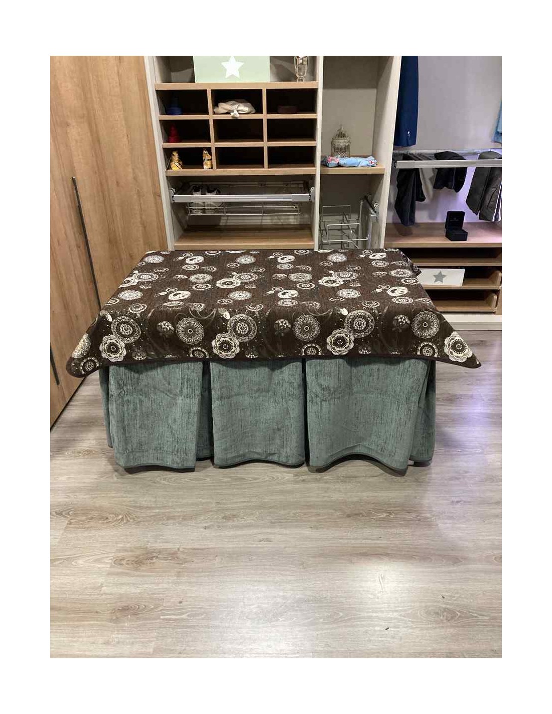 Confeccionada con 10 pliegues para mantener el calor de manera eficiente. Las tablas comunmente llamados pliegues, favorecen la retención de la temperatura impidiendo escapar el calor cuando nos sentamos en la mesa y nos cubrimos con ella. Gracias a nuestro diseño en los fuelles la falda de mesa camilla caerá cubriéndono los laterales e impidiendo que escape el calor.
