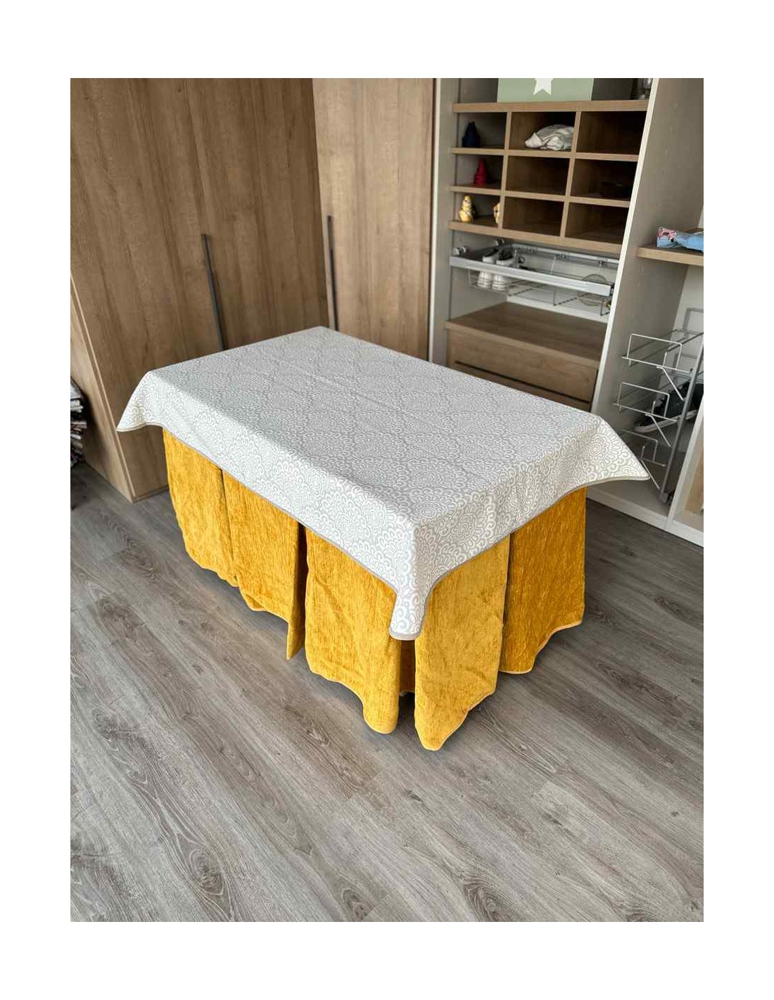 Confeccionada con 10 pliegues para mantener el calor de manera eficiente. Las tablas comunmente llamados pliegues, favorecen la retención de la temperatura impidiendo escapar el calor cuando nos sentamos en la mesa y nos cubrimos con ella. Gracias a nuestro diseño en los fuelles la falda de mesa camilla caerá cubriéndono los laterales e impidiendo que escape el calor.
