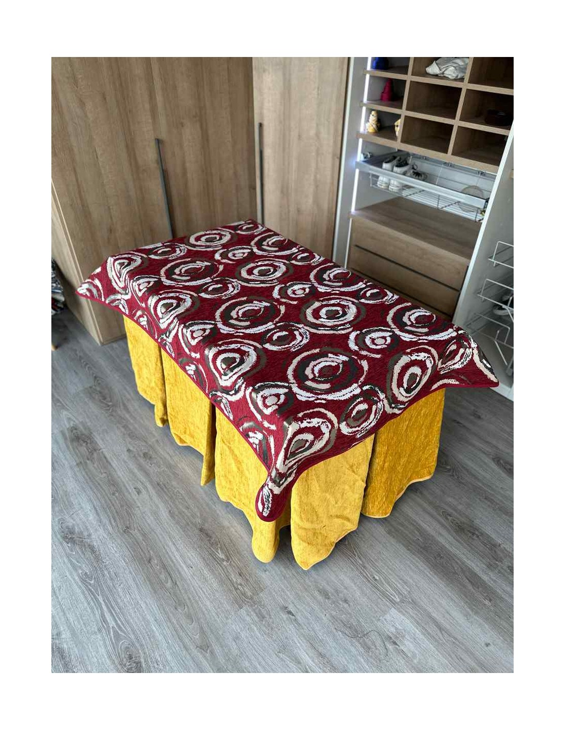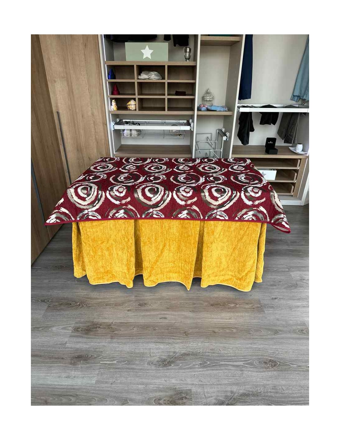 Confeccionada con 10 pliegues para mantener el calor de manera eficiente. Las tablas comunmente llamados pliegues, favorecen la retención de la temperatura impidiendo escapar el calor cuando nos sentamos en la mesa y nos cubrimos con ella. Gracias a nuestro diseño en los fuelles la falda de mesa camilla caerá cubriéndono los laterales e impidiendo que escape el calor.