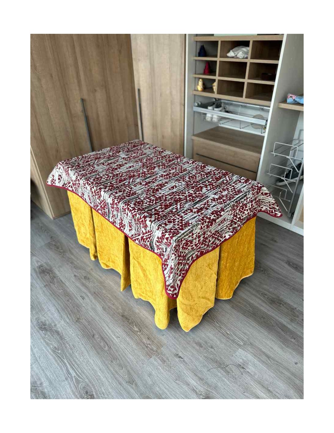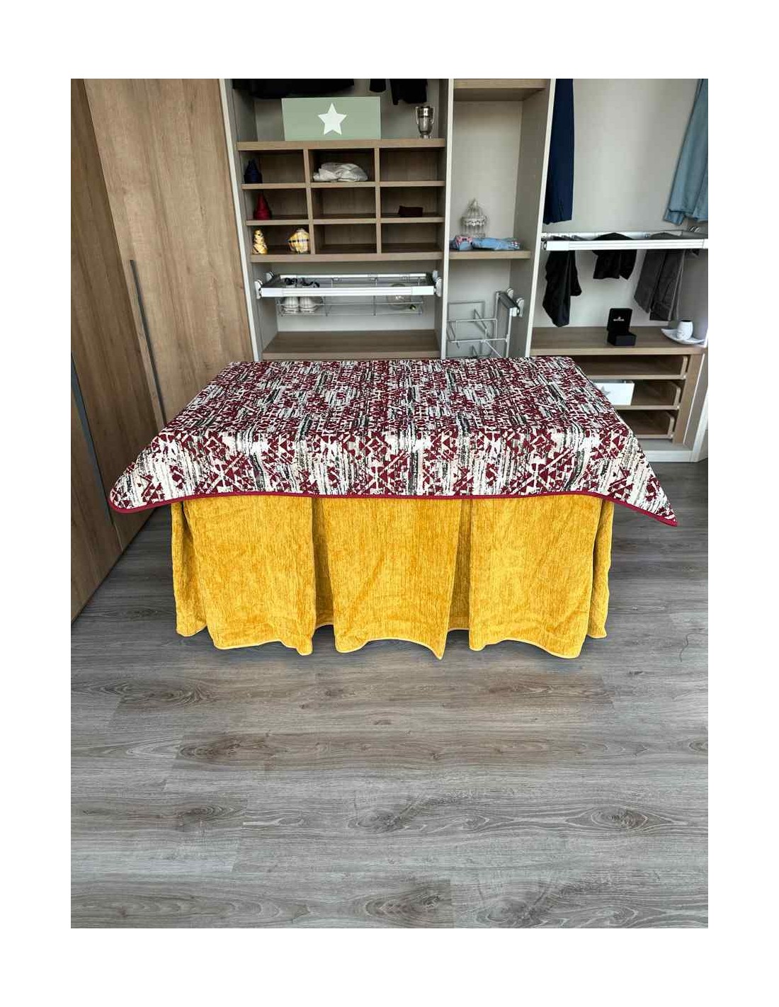 Confeccionada con 10 pliegues para mantener el calor de manera eficiente. Las tablas comunmente llamados pliegues, favorecen la retención de la temperatura impidiendo escapar el calor cuando nos sentamos en la mesa y nos cubrimos con ella. Gracias a nuestro diseño en los fuelles la falda de mesa camilla caerá cubriéndono los laterales e impidiendo que escape el calor.