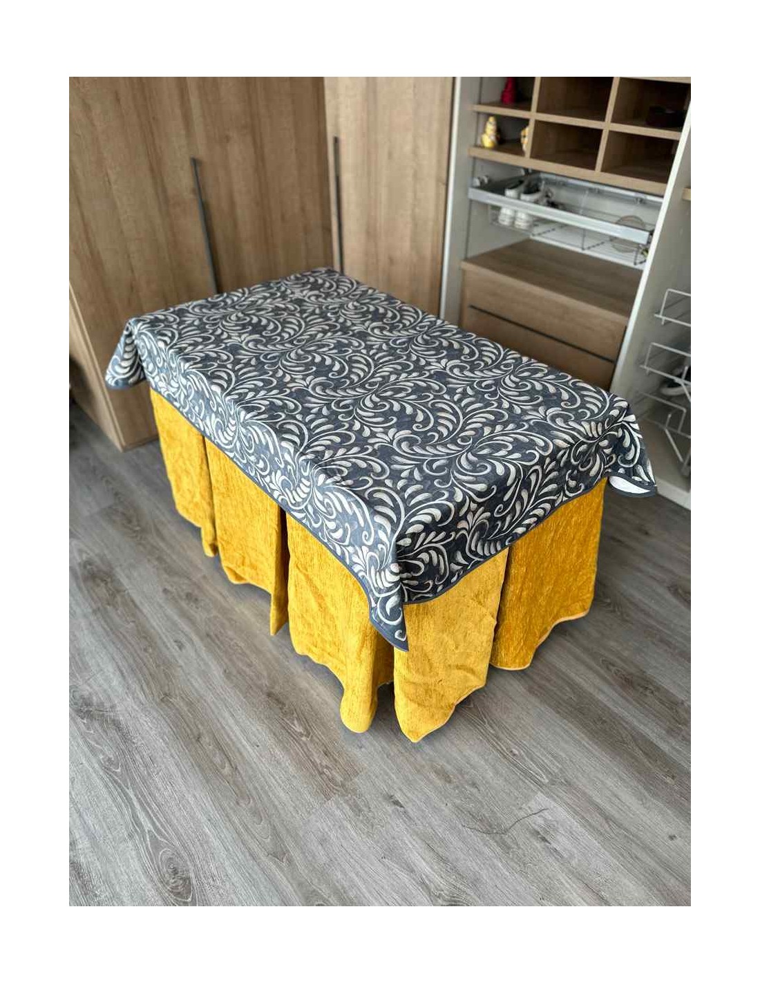 Confeccionada con 10 pliegues para mantener el calor de manera eficiente. Las tablas comunmente llamados pliegues, favorecen la retención de la temperatura impidiendo escapar el calor cuando nos sentamos en la mesa y nos cubrimos con ella. Gracias a nuestro diseño en los fuelles la falda de mesa camilla caerá cubriéndono los laterales e impidiendo que escape el calor.