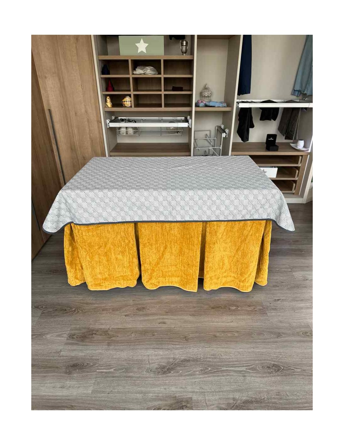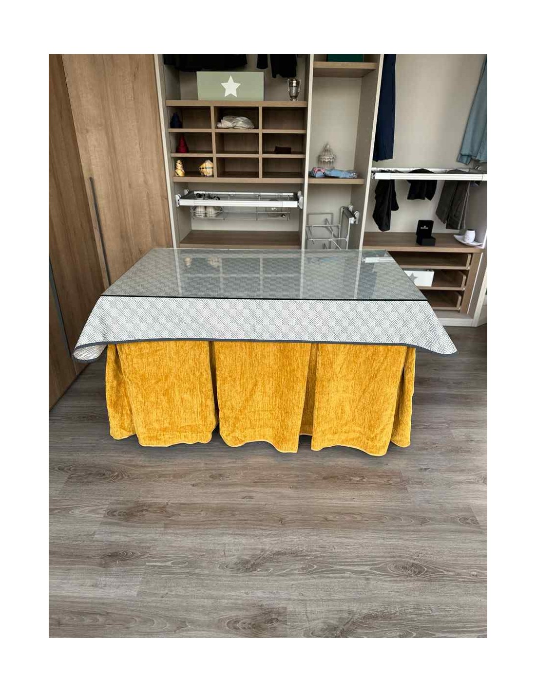 Confeccionada con 10 pliegues para mantener el calor de manera eficiente. Las tablas comunmente llamados pliegues, favorecen la retención de la temperatura impidiendo escapar el calor cuando nos sentamos en la mesa y nos cubrimos con ella. Gracias a nuestro diseño en los fuelles la falda de mesa camilla caerá cubriéndono los laterales e impidiendo que escape el calor.