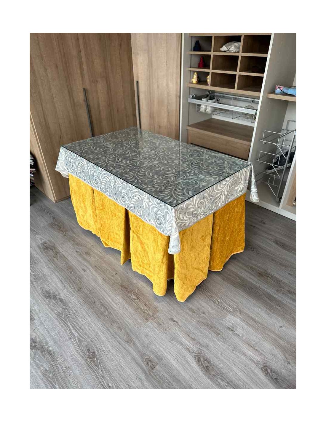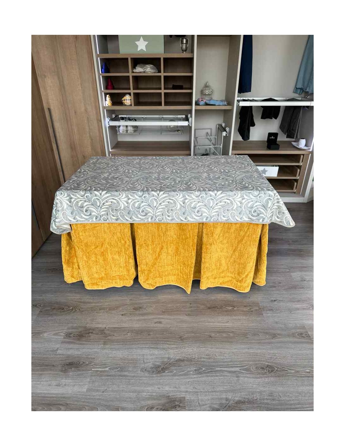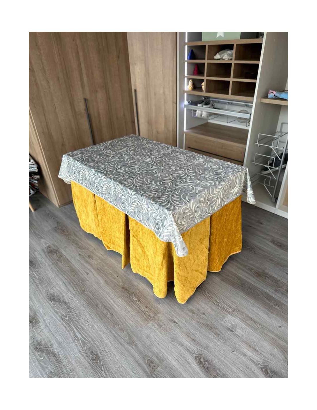 Confeccionada con 10 pliegues para mantener el calor de manera eficiente. Las tablas comunmente llamados pliegues, favorecen la retención de la temperatura impidiendo escapar el calor cuando nos sentamos en la mesa y nos cubrimos con ella. Gracias a nuestro diseño en los fuelles la falda de mesa camilla caerá cubriéndono los laterales e impidiendo que escape el calor.