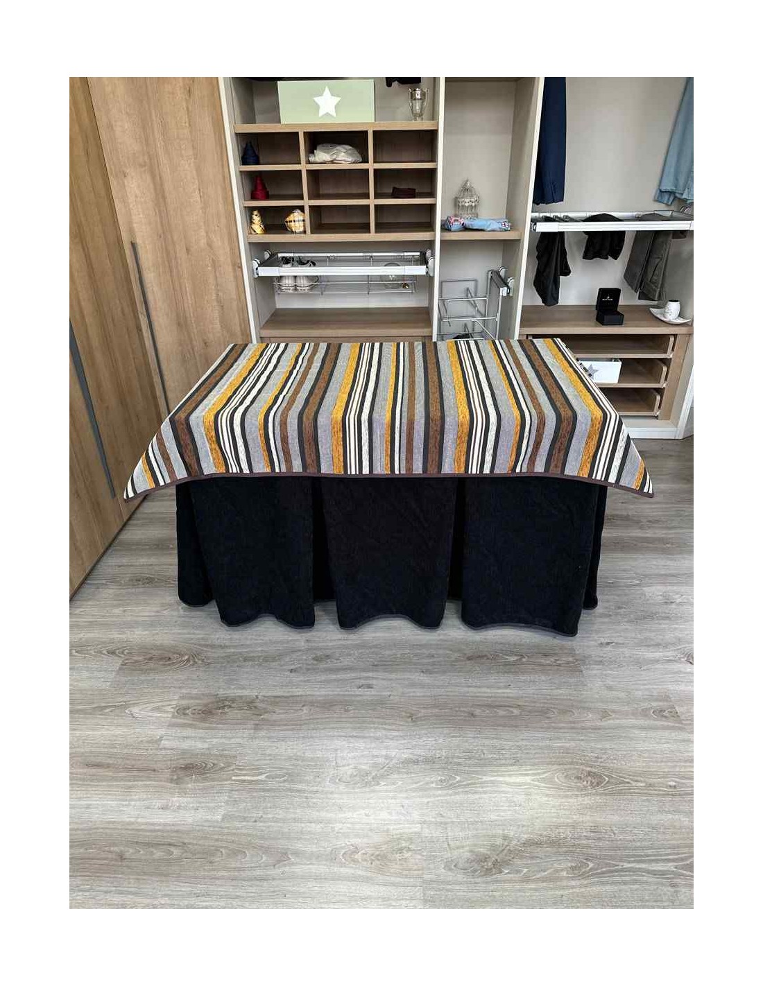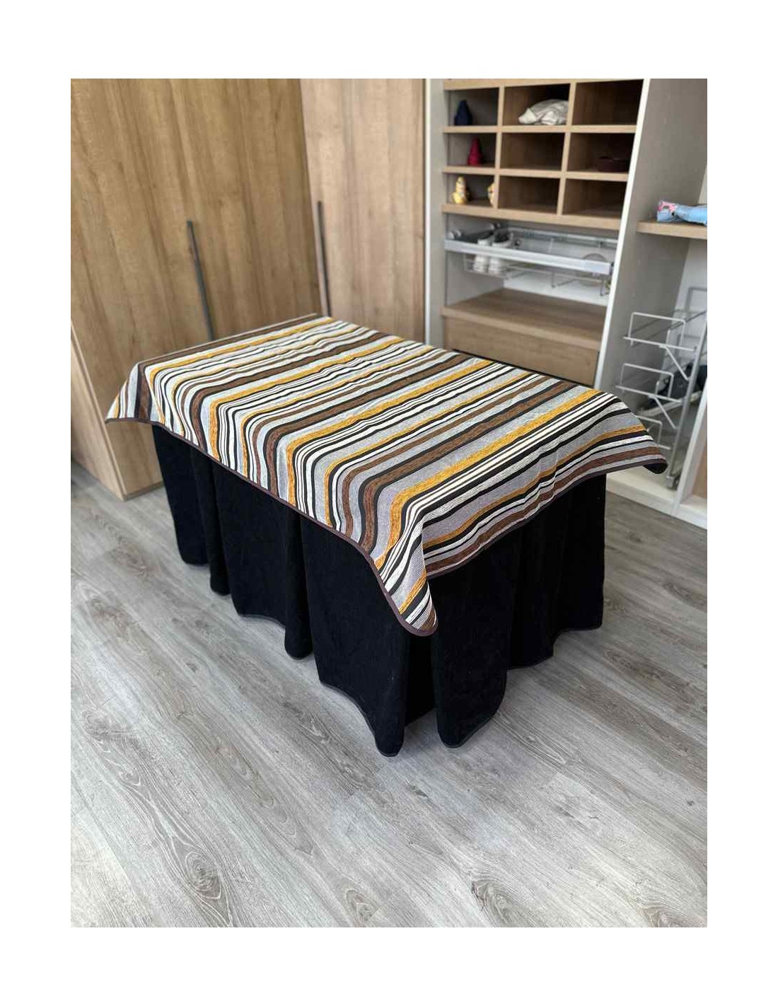 Confeccionada con 10 pliegues para mantener el calor de manera eficiente. Las tablas comunmente llamados pliegues, favorecen la retención de la temperatura impidiendo escapar el calor cuando nos sentamos en la mesa y nos cubrimos con ella. Gracias a nuestro diseño en los fuelles la falda de mesa camilla caerá cubriéndono los laterales e impidiendo que escape el calor.
