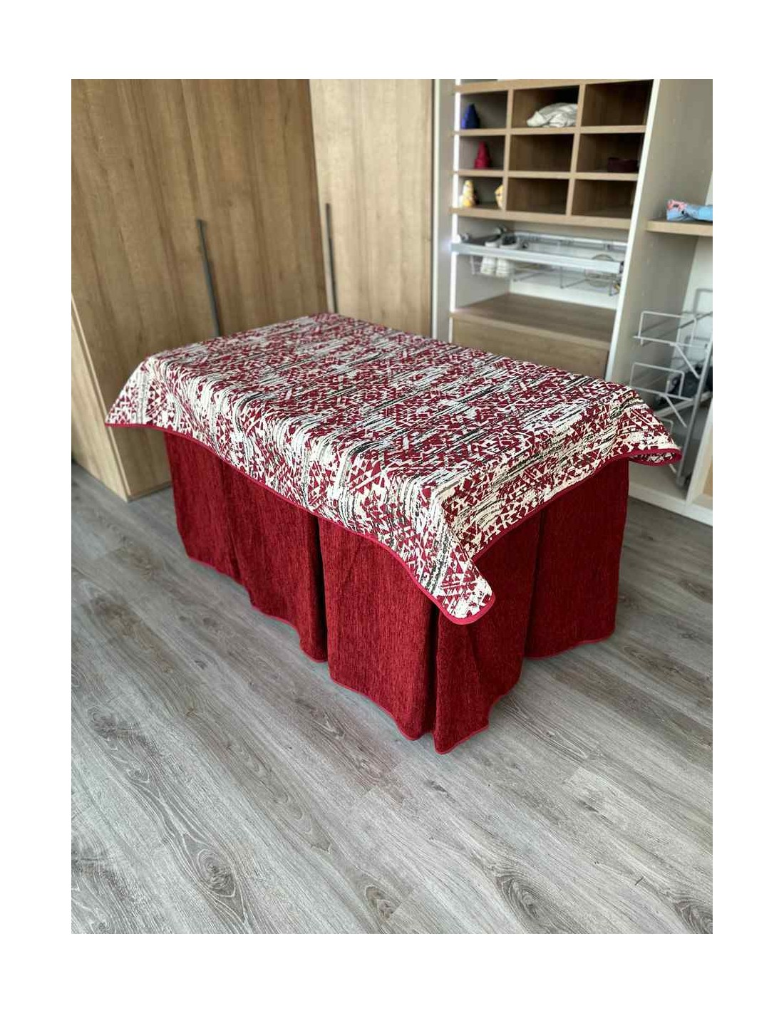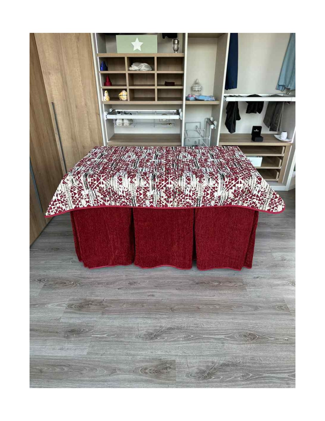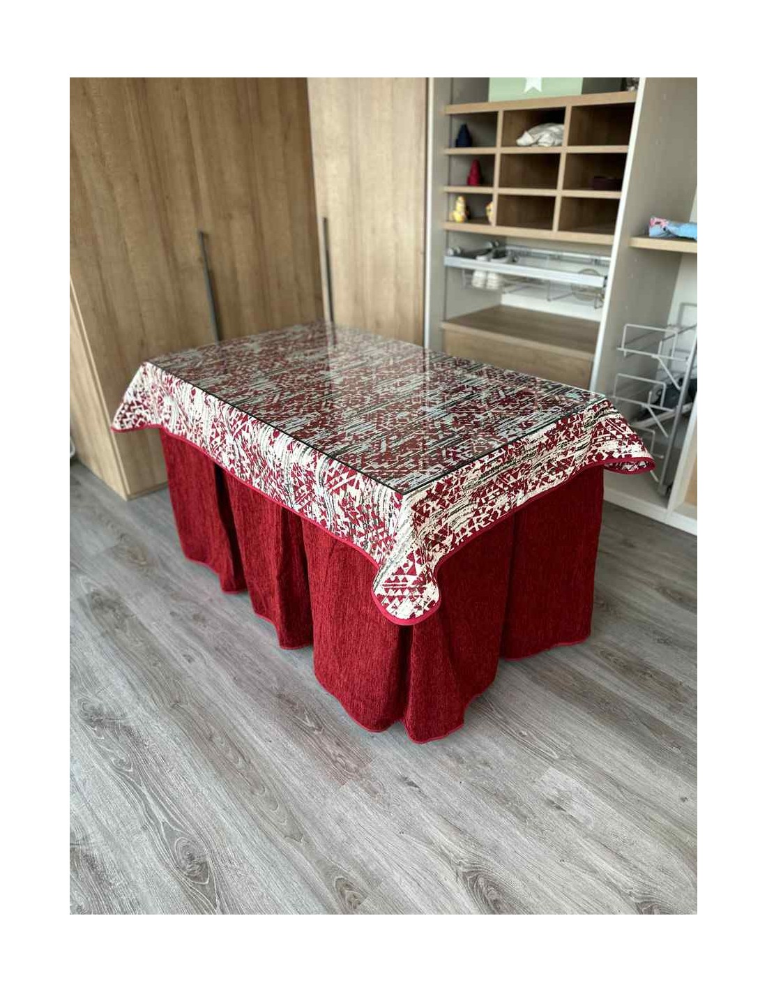 Confeccionada con 10 pliegues para mantener el calor de manera eficiente. Las tablas comunmente llamados pliegues, favorecen la retención de la temperatura impidiendo escapar el calor cuando nos sentamos en la mesa y nos cubrimos con ella. Gracias a nuestro diseño en los fuelles la falda de mesa camilla caerá cubriéndono los laterales e impidiendo que escape el calor.