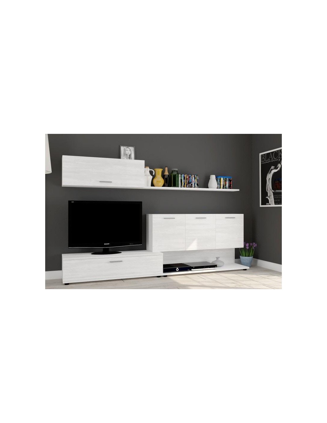 Conjunto de muebles de salón en color blanco compuesto por mueble de television en blanco acompañado de estanteria y armario de tres puertas.