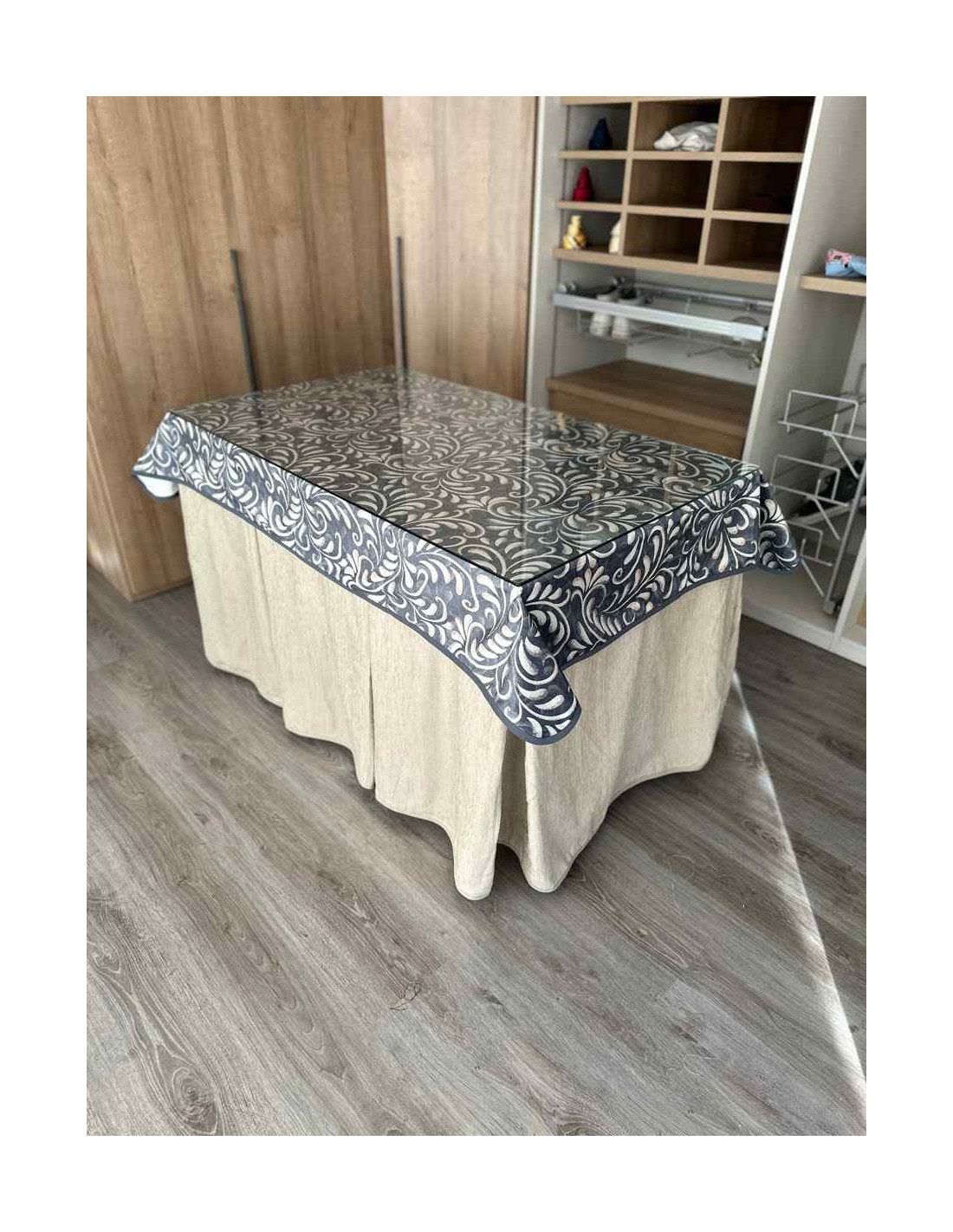 Confeccionada con 8 pliegues para mantener el calor de manera eficiente. Las tablas comunmente llamados pliegues, favorecen la retención de la temperatura impidiendo escapar el calor cuando nos sentamos en la mesa y nos cubrimos con ella. Gracias a nuestro diseño en los fuelles la falda de mesa camilla caerá cubriéndono los laterales e impidiendo que escape el calor.