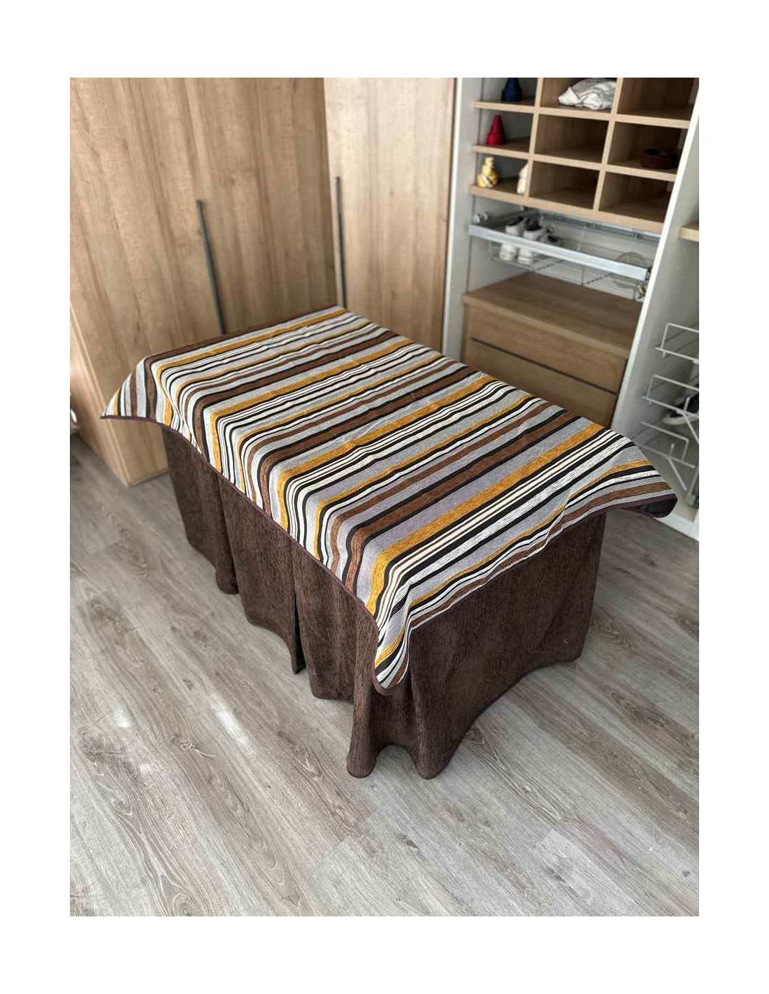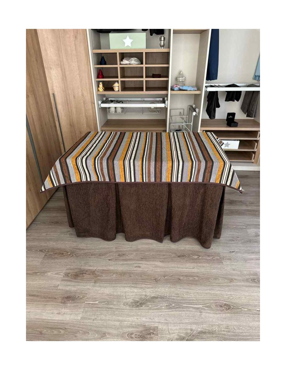 Confeccionada con 8 pliegues para mantener el calor de manera eficiente. Las tablas comunmente llamados pliegues, favorecen la retención de la temperatura impidiendo escapar el calor cuando nos sentamos en la mesa y nos cubrimos con ella. Gracias a nuestro diseño en los fuelles la falda de mesa camilla caerá cubriéndono los laterales e impidiendo que escape el calor.