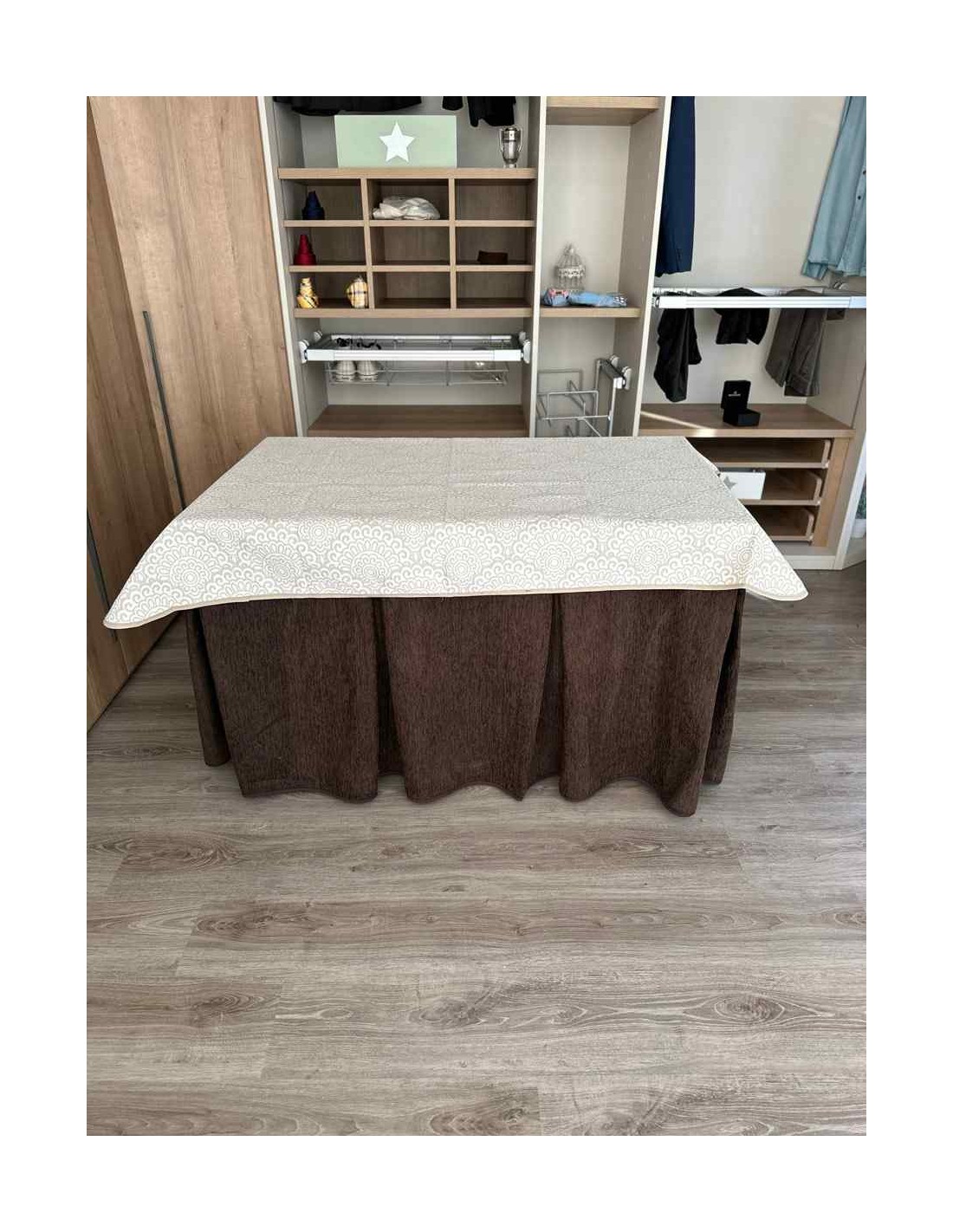 Confeccionada con 8 pliegues para mantener el calor de manera eficiente. Las tablas comunmente llamados pliegues, favorecen la retención de la temperatura impidiendo escapar el calor cuando nos sentamos en la mesa y nos cubrimos con ella. Gracias a nuestro diseño en los fuelles la falda de mesa camilla caerá cubriéndono los laterales e impidiendo que escape el calor.