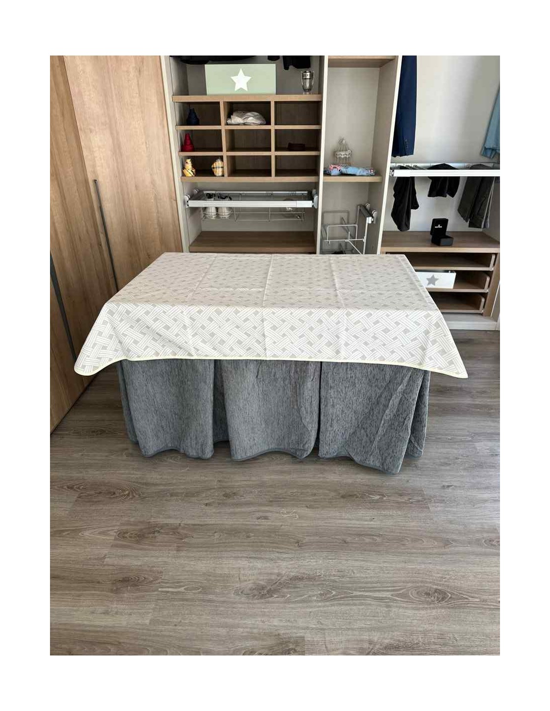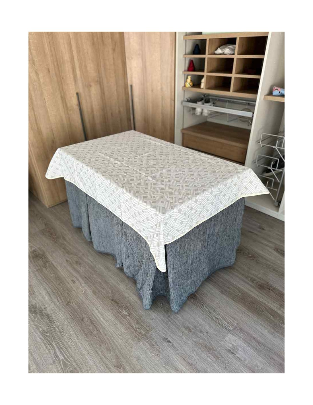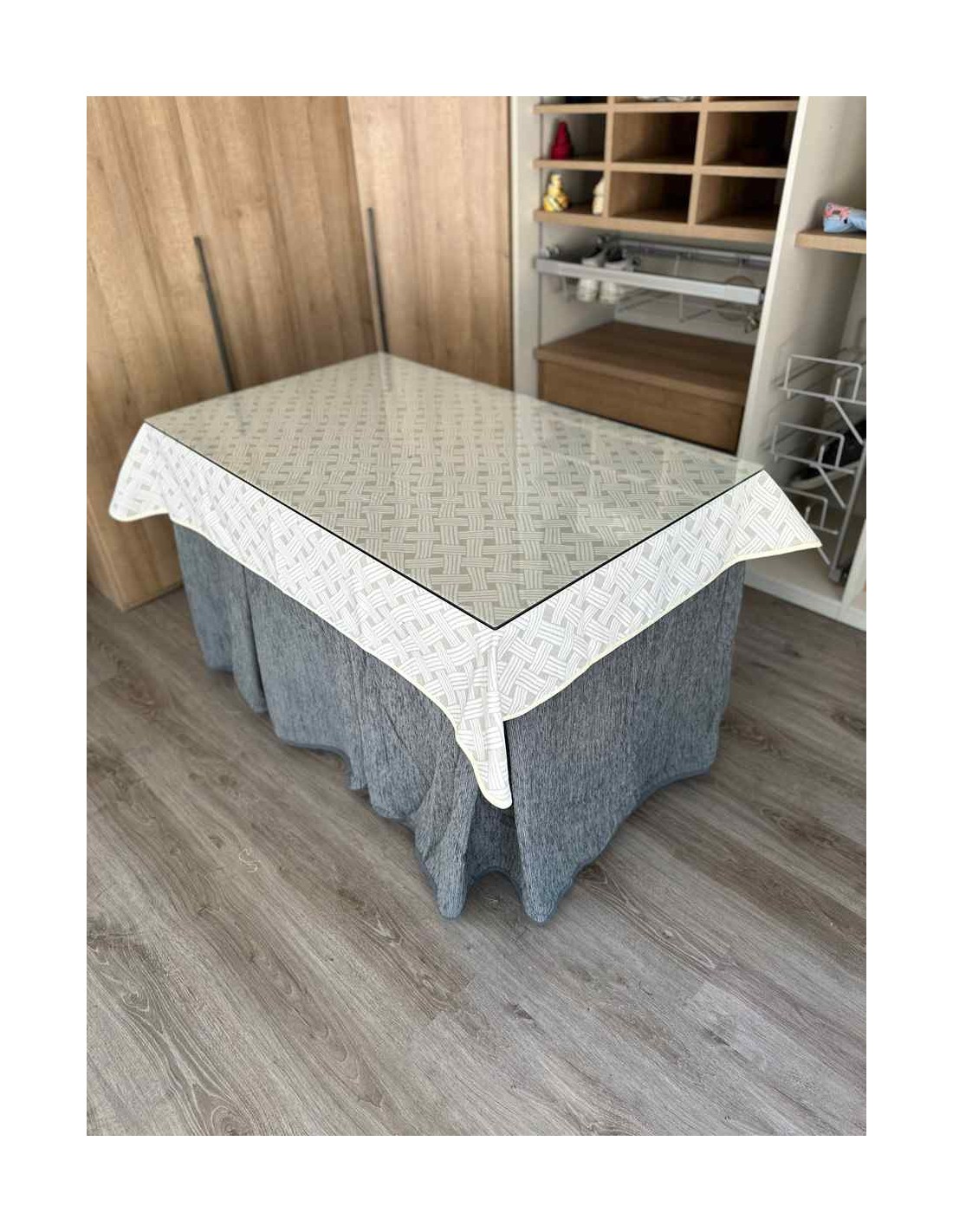 Confeccionada con 8 pliegues para mantener el calor de manera eficiente. Las tablas comunmente llamados pliegues, favorecen la retención de la temperatura impidiendo escapar el calor cuando nos sentamos en la mesa y nos cubrimos con ella. Gracias a nuestro diseño en los fuelles la falda de mesa camilla caerá cubriéndono los laterales e impidiendo que escape el calor.