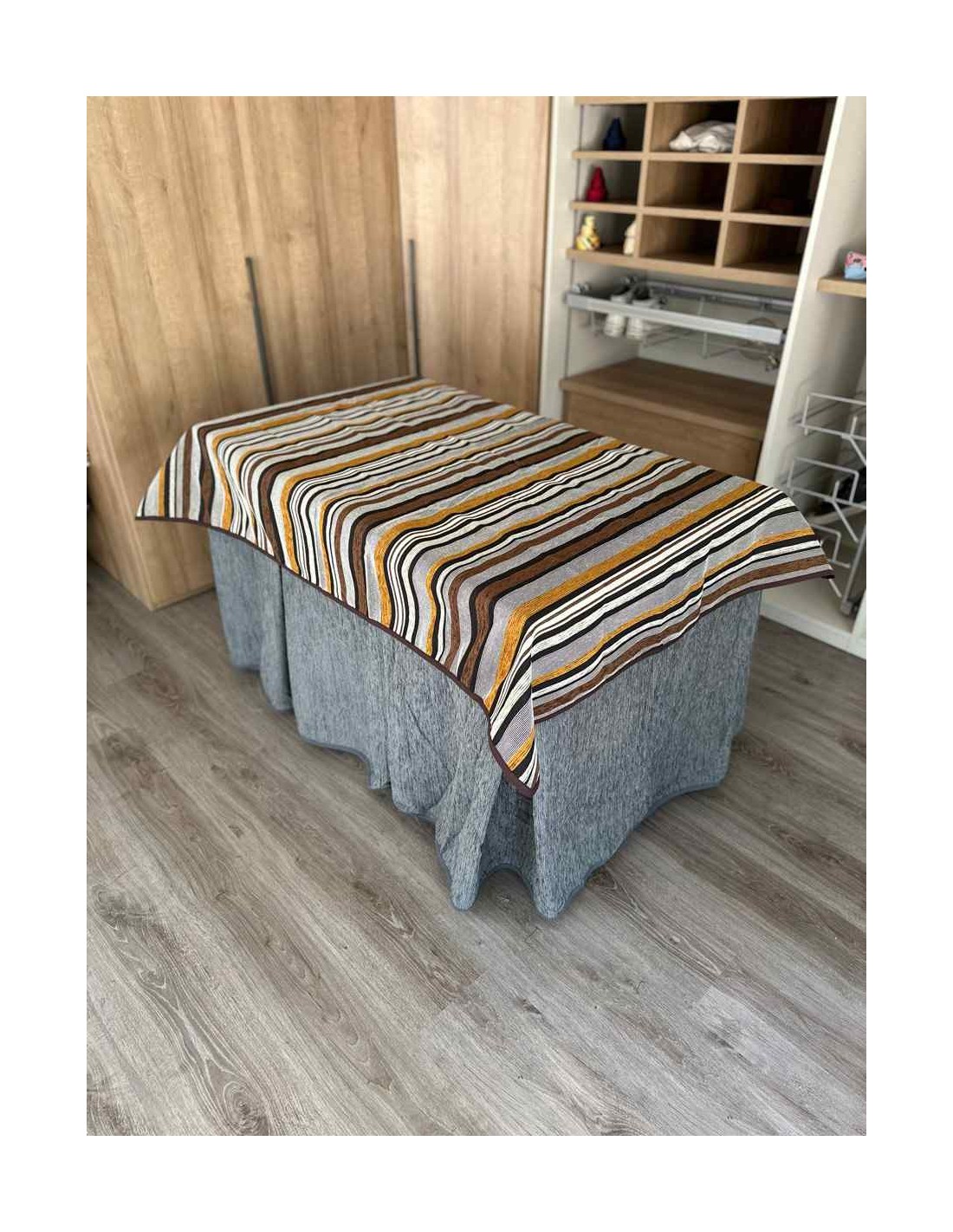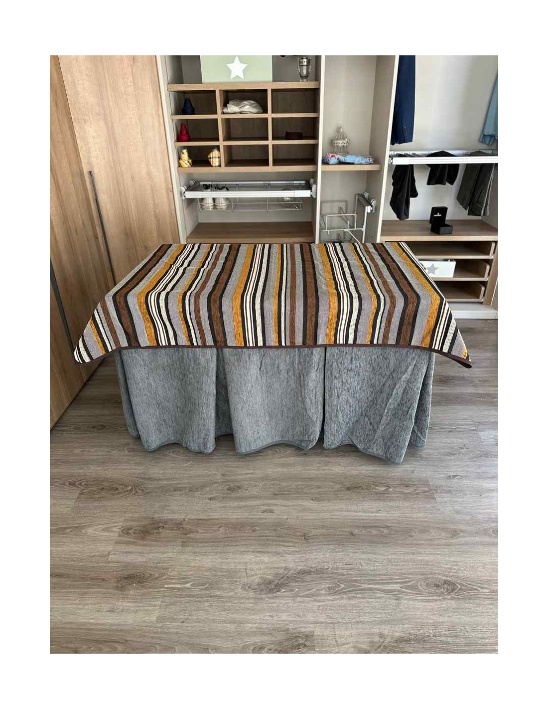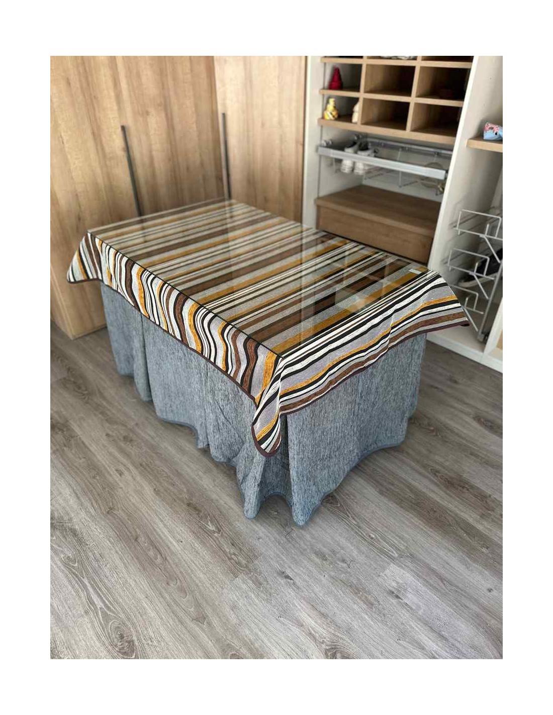 Confeccionada con 8 pliegues para mantener el calor de manera eficiente. Las tablas comunmente llamados pliegues, favorecen la retención de la temperatura impidiendo escapar el calor cuando nos sentamos en la mesa y nos cubrimos con ella. Gracias a nuestro diseño en los fuelles la falda de mesa camilla caerá cubriéndono los laterales e impidiendo que escape el calor.