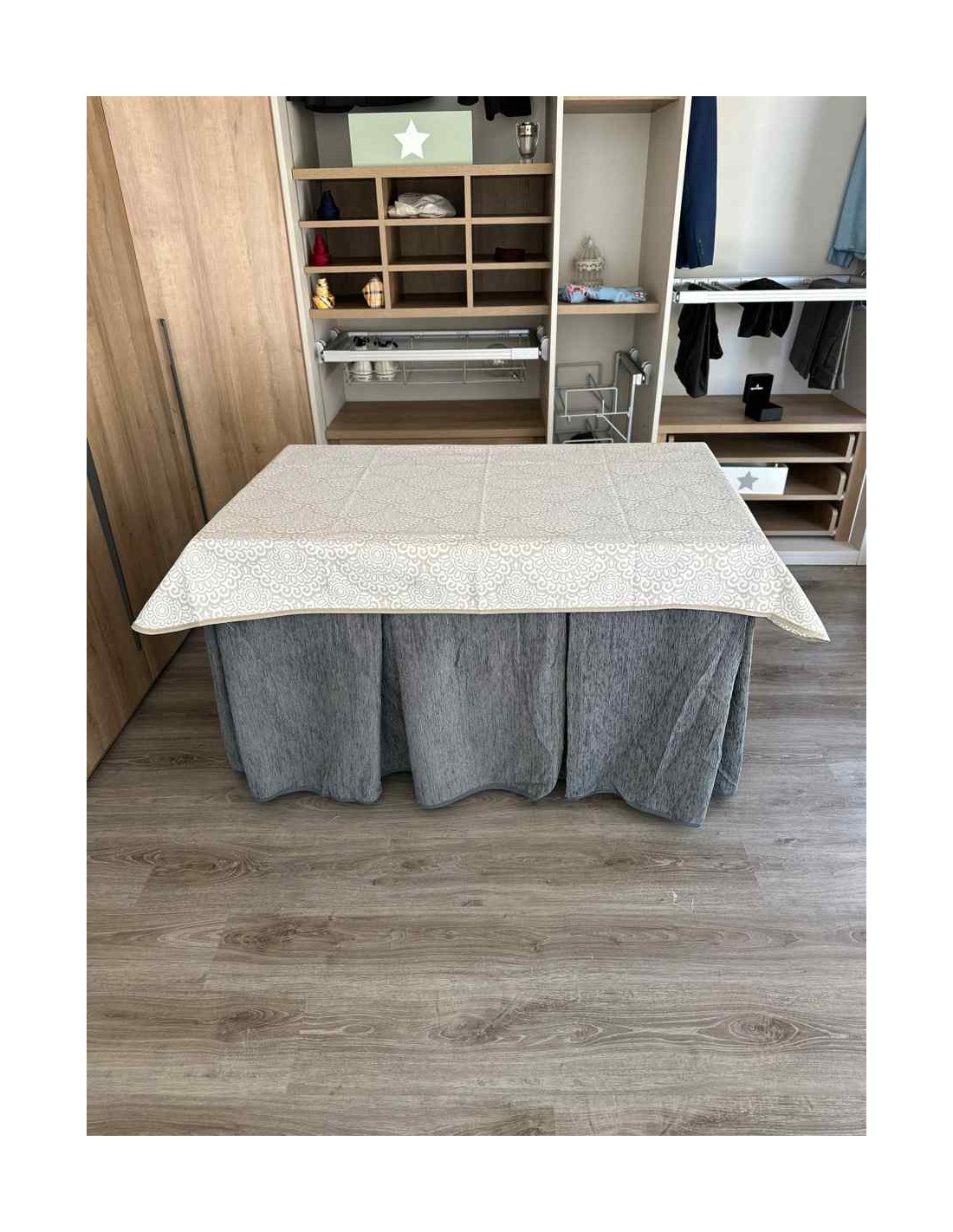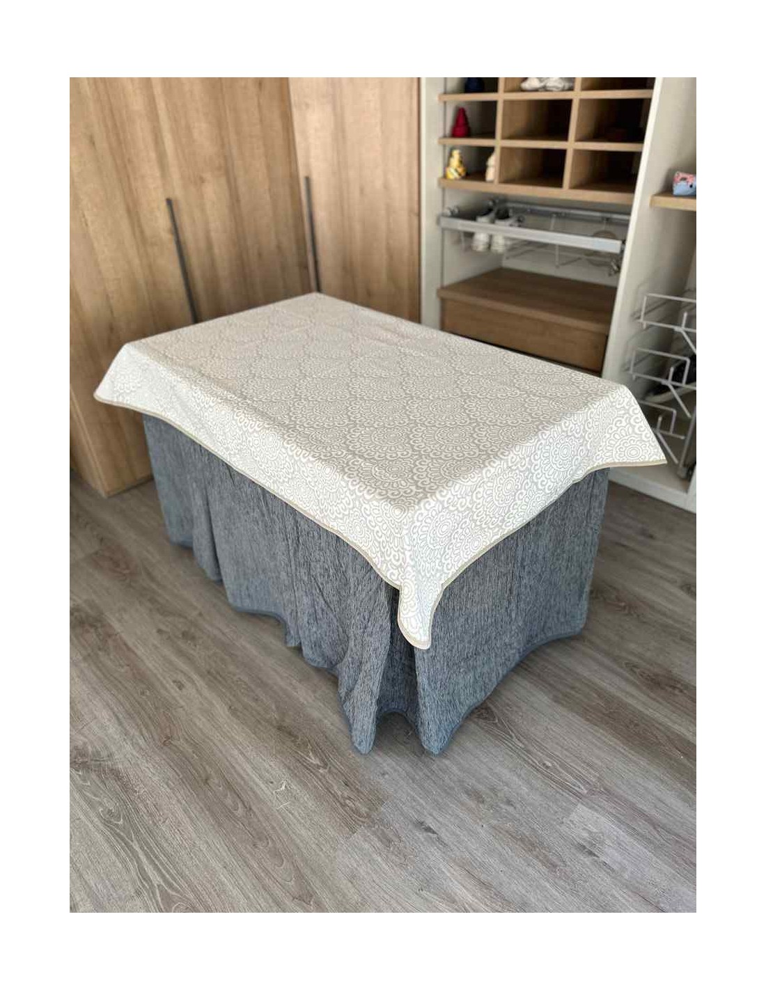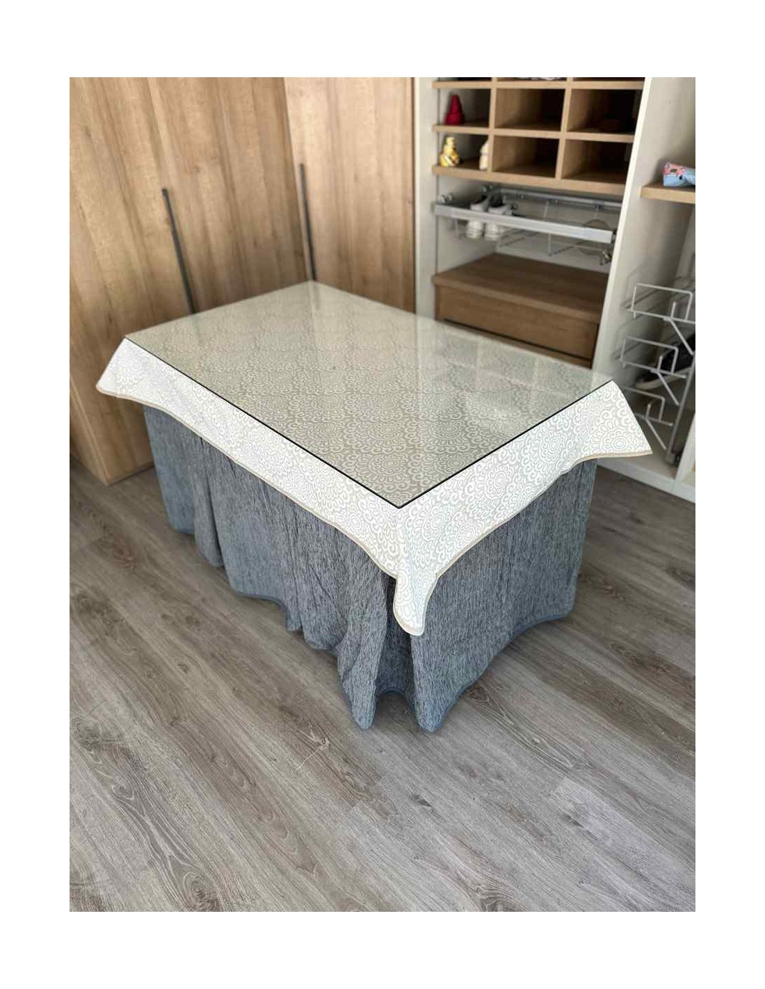 Confeccionada con 8 pliegues para mantener el calor de manera eficiente. Las tablas comunmente llamados pliegues, favorecen la retención de la temperatura impidiendo escapar el calor cuando nos sentamos en la mesa y nos cubrimos con ella. Gracias a nuestro diseño en los fuelles la falda de mesa camilla caerá cubriéndono los laterales e impidiendo que escape el calor.