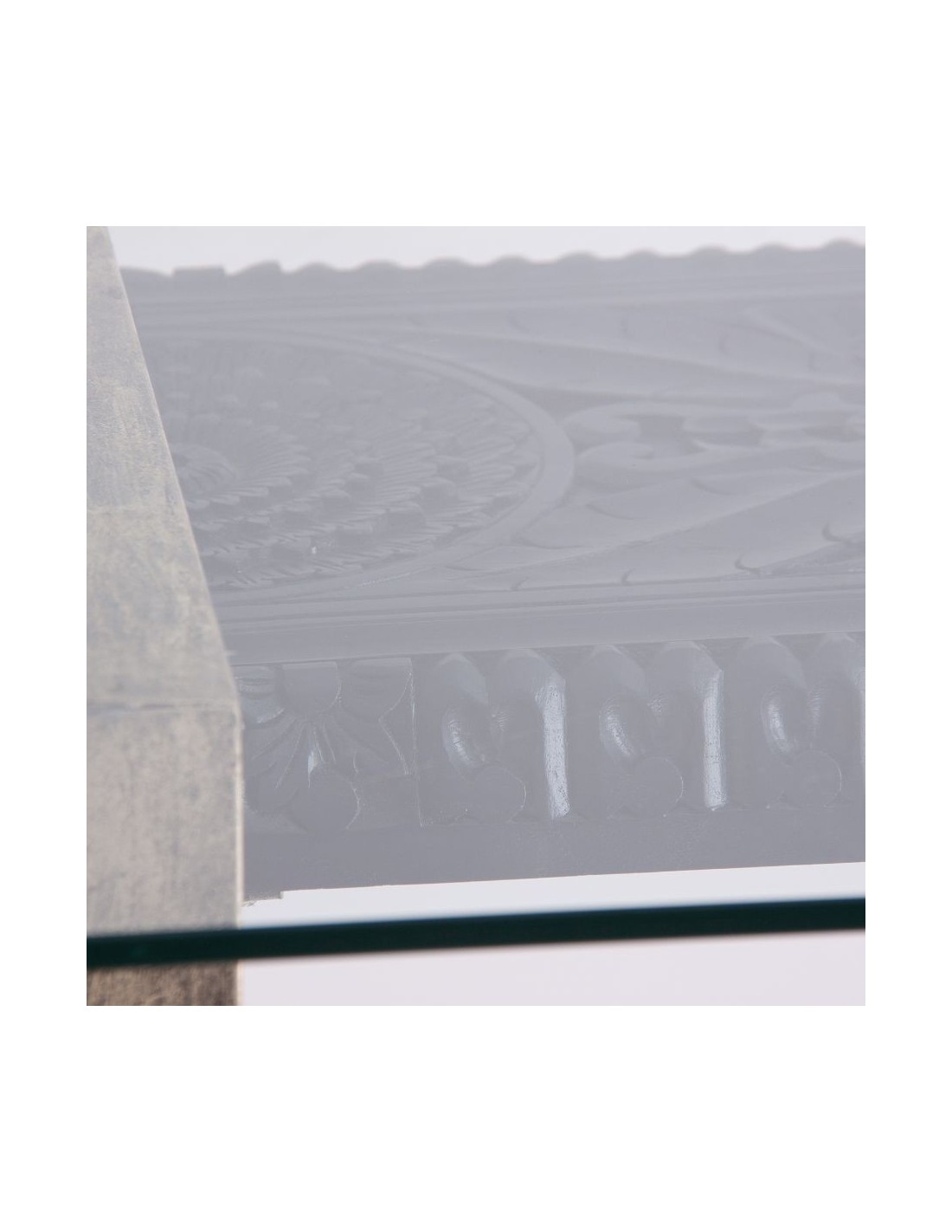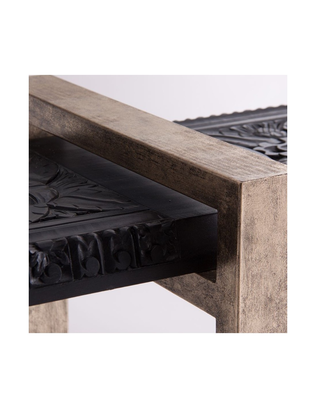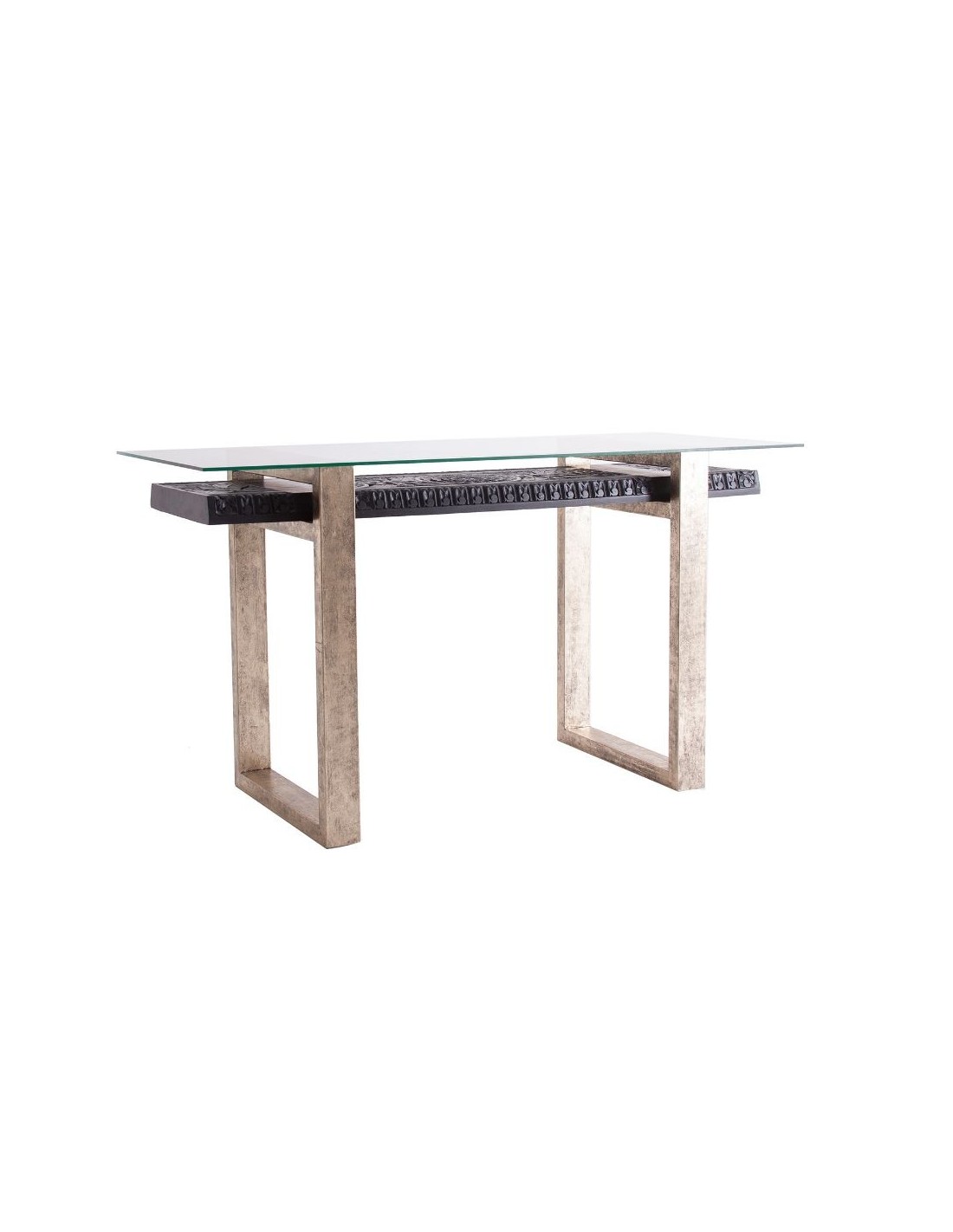 Consola Zúrich, En Color Oro/Negro Tallado, De Estilo Art Deco. Fabricado En Madera Mindi, Combinado Con Vidrio. Producto Desmontable.